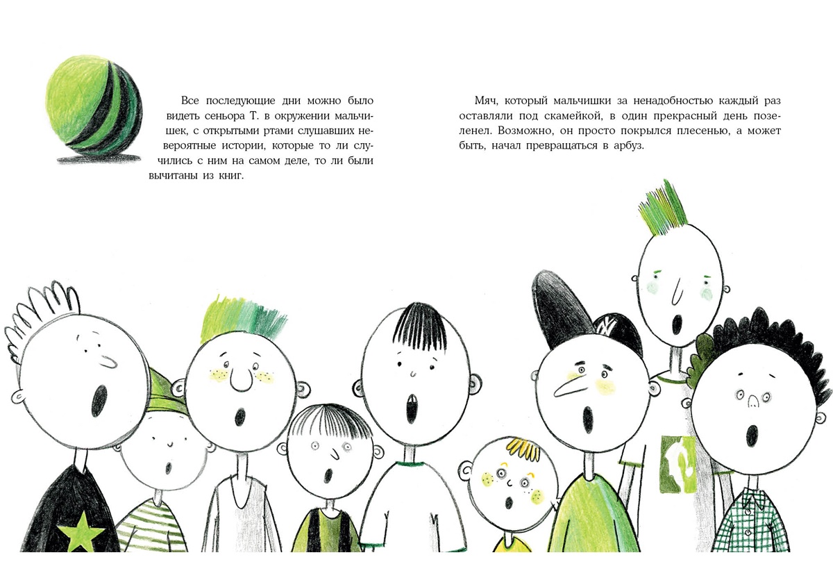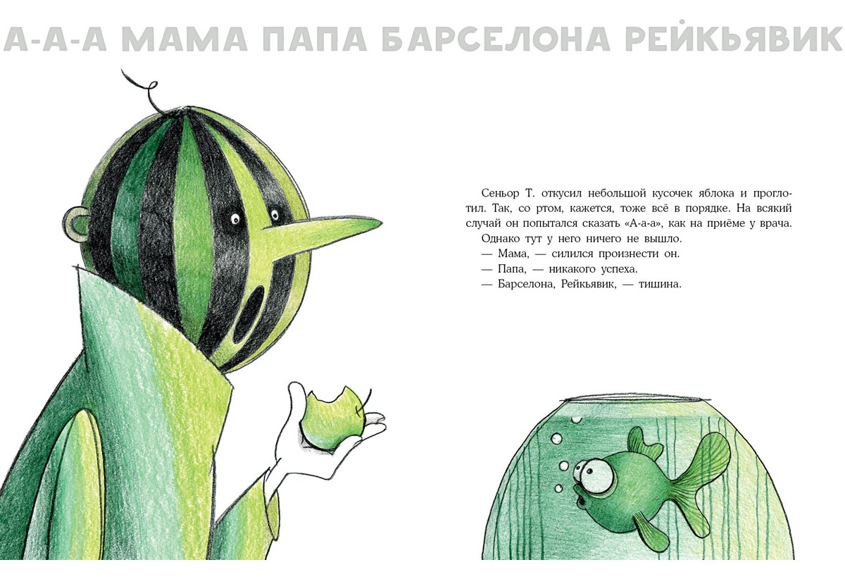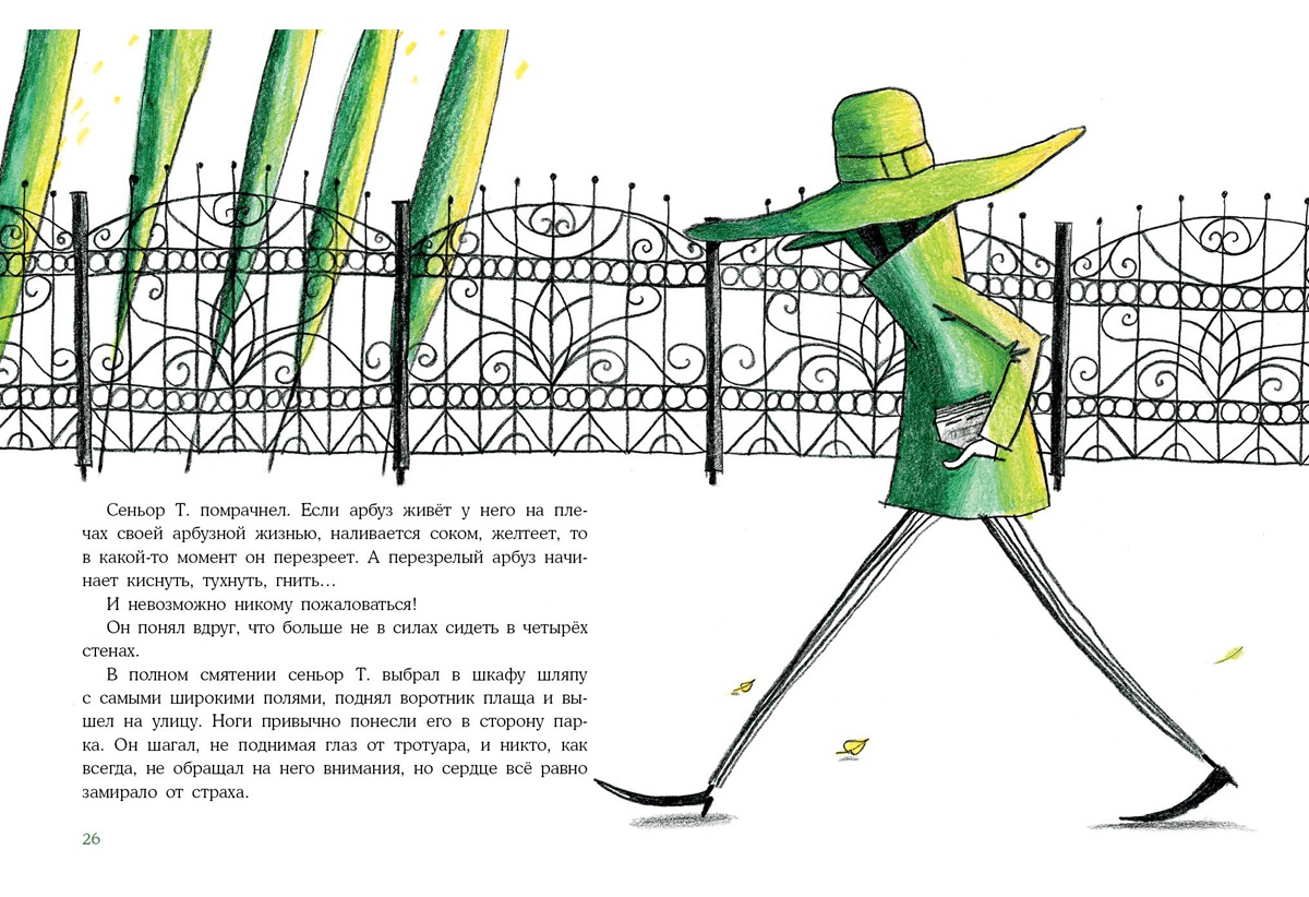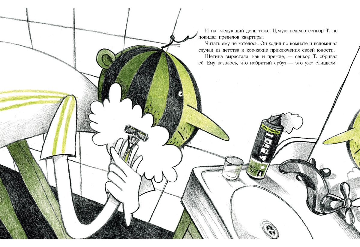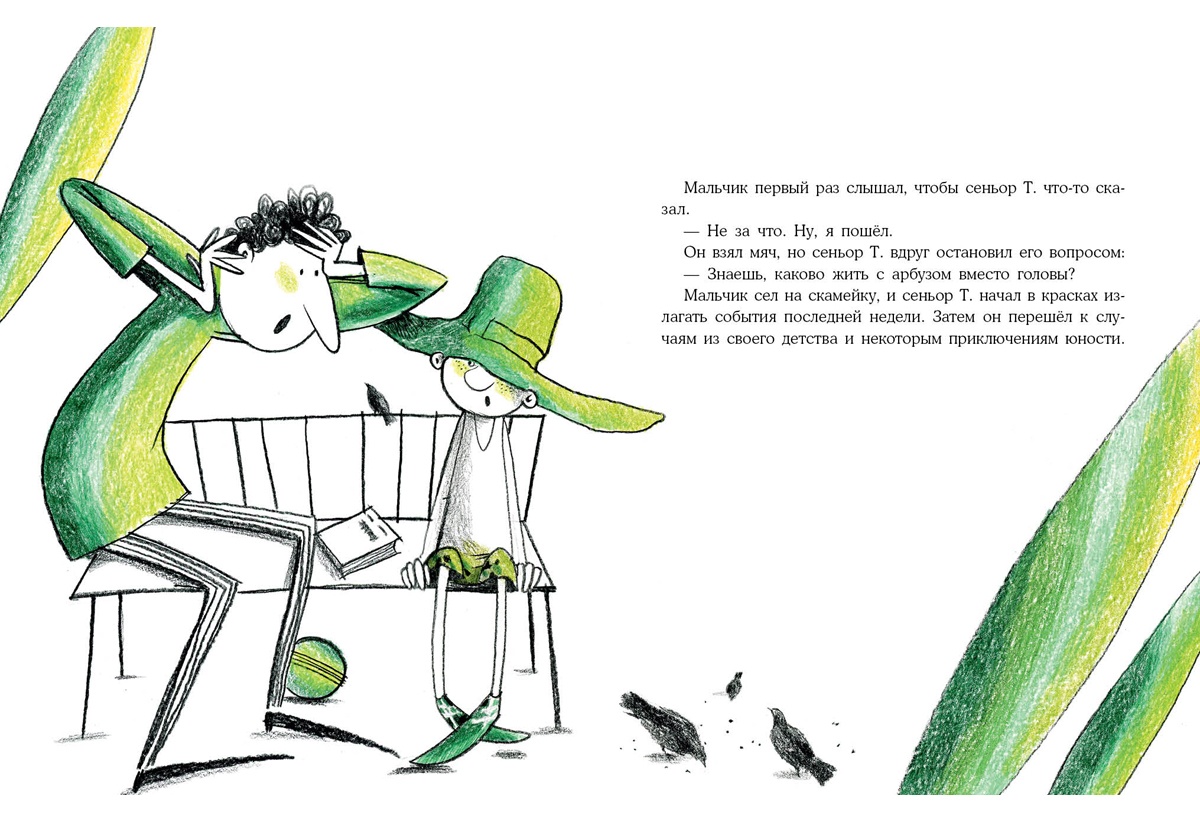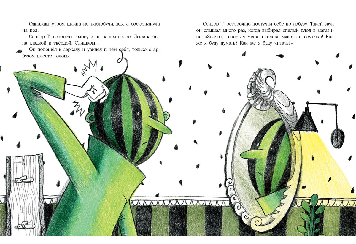 И так продолжалось бы очень долго, но однажды утром сеньор Т. не смог надеть шляпу. Он потрогал голову и не нашёл волос. Лысина была гладкой и твёрдой. Слишком… Посмотрев на себя в зеркало, сеньор Т. увидел в нём арбуз вместо головы! На секунду сеньор Т. даже возгордился, что именно с ним произошло такое событие. Но как же теперь быть, если у него на плечах будет жить арбуз своей арбузной жизнью? И к кому обратиться за помощью? Ведь сеньор Т. больше не мог говорить-