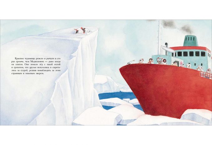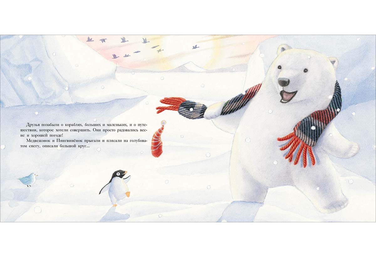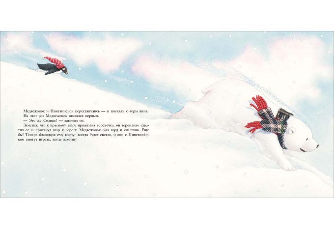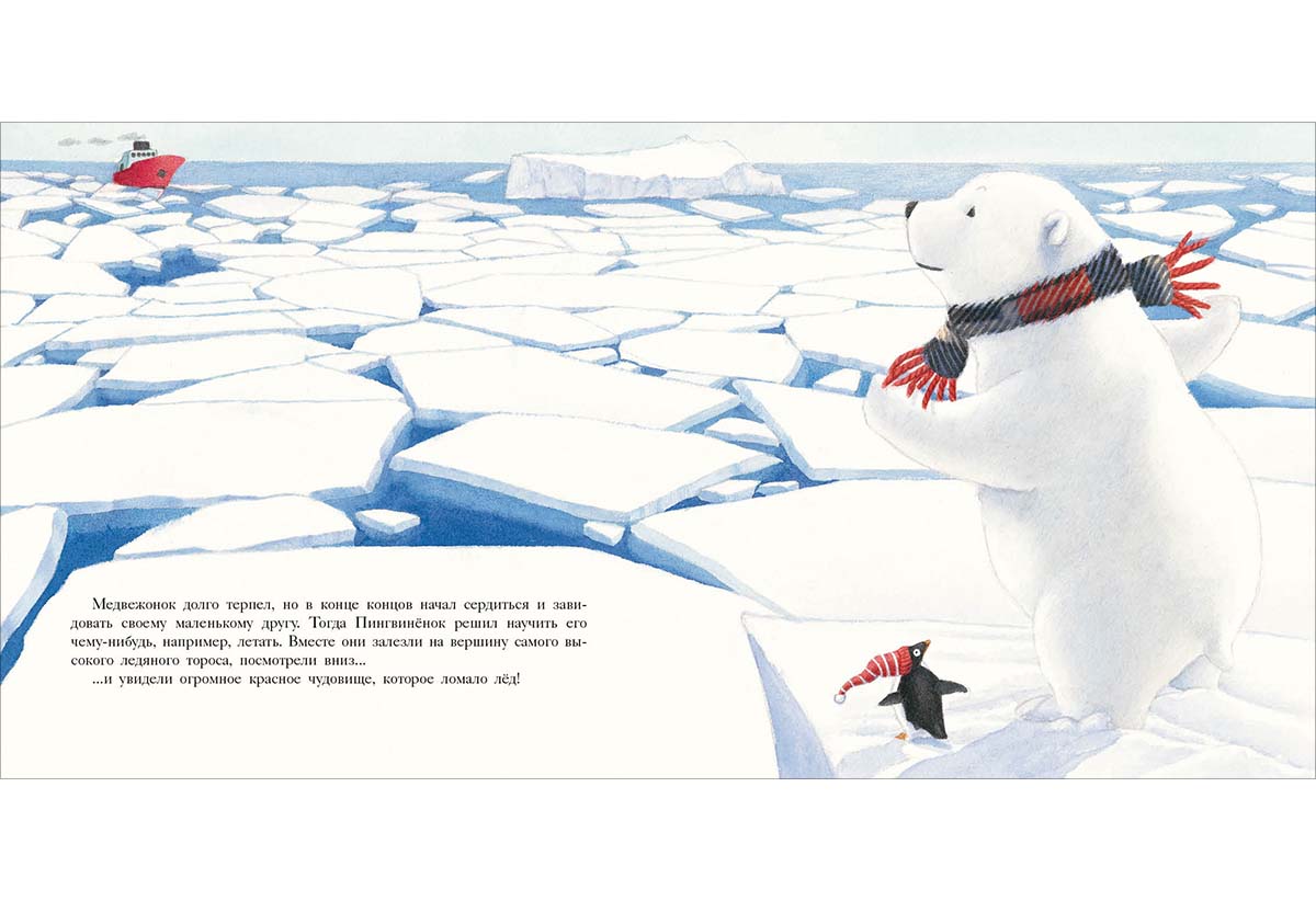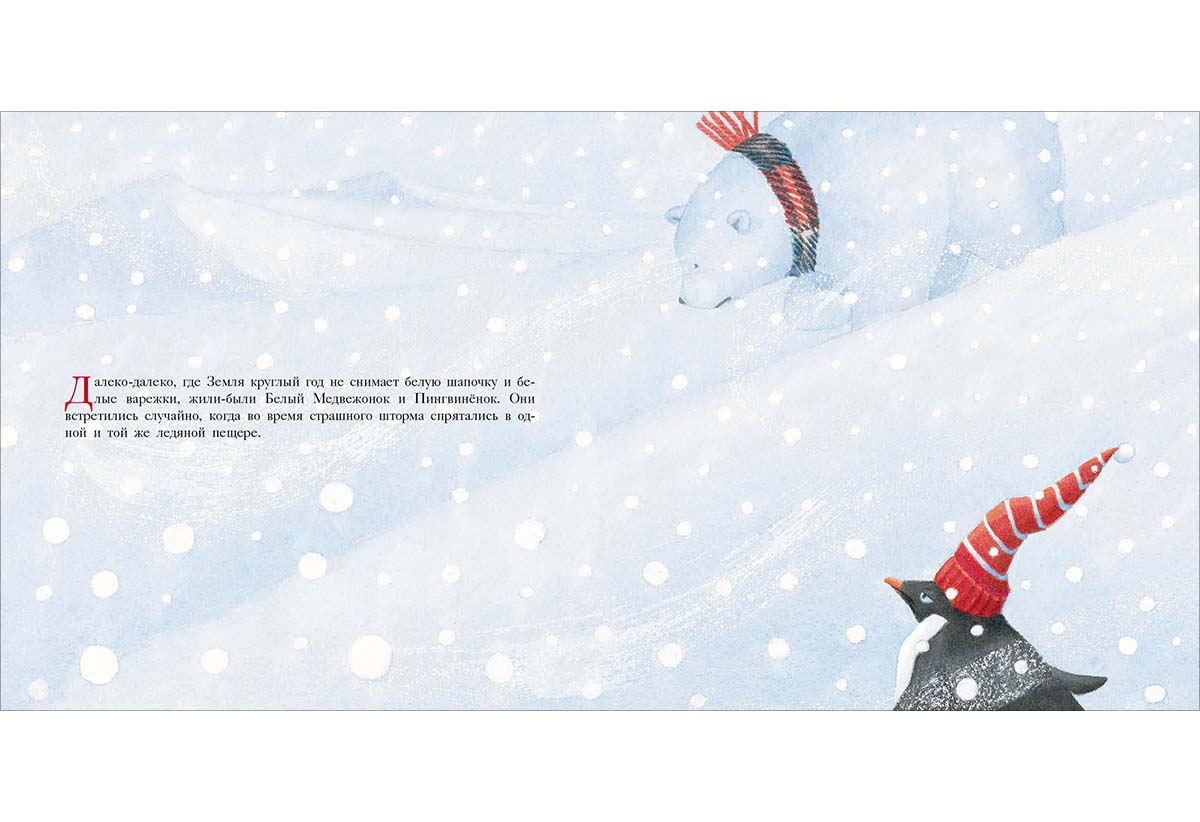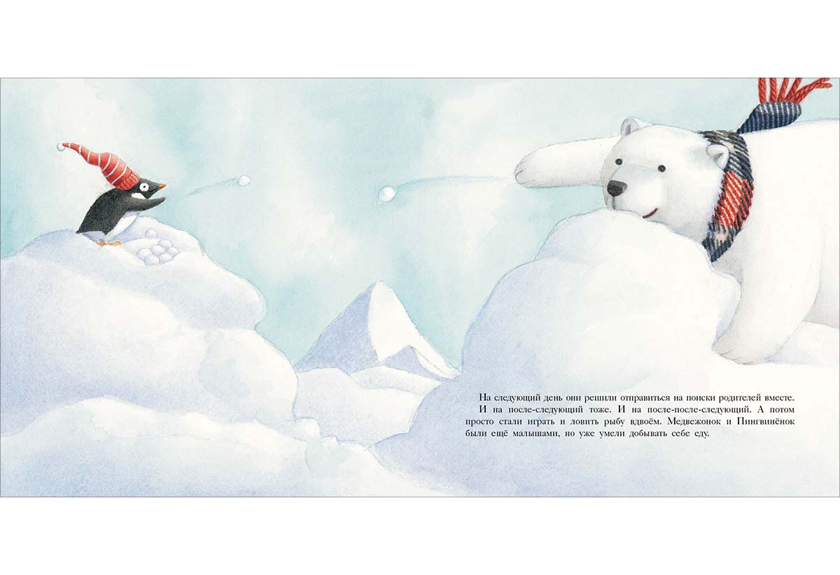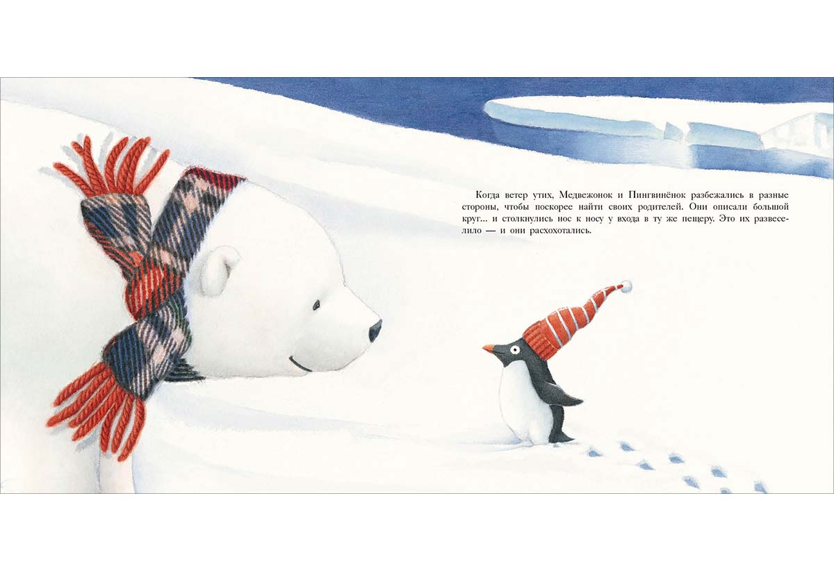 КнигиГерои этой книги — Белый Медвежонок и маленький Пингвинёнок. Они вместе пережидали шторм в снежной пещере и крепко подружились, а теперь вместе играют и с любопытством исследуют мир вокруг.