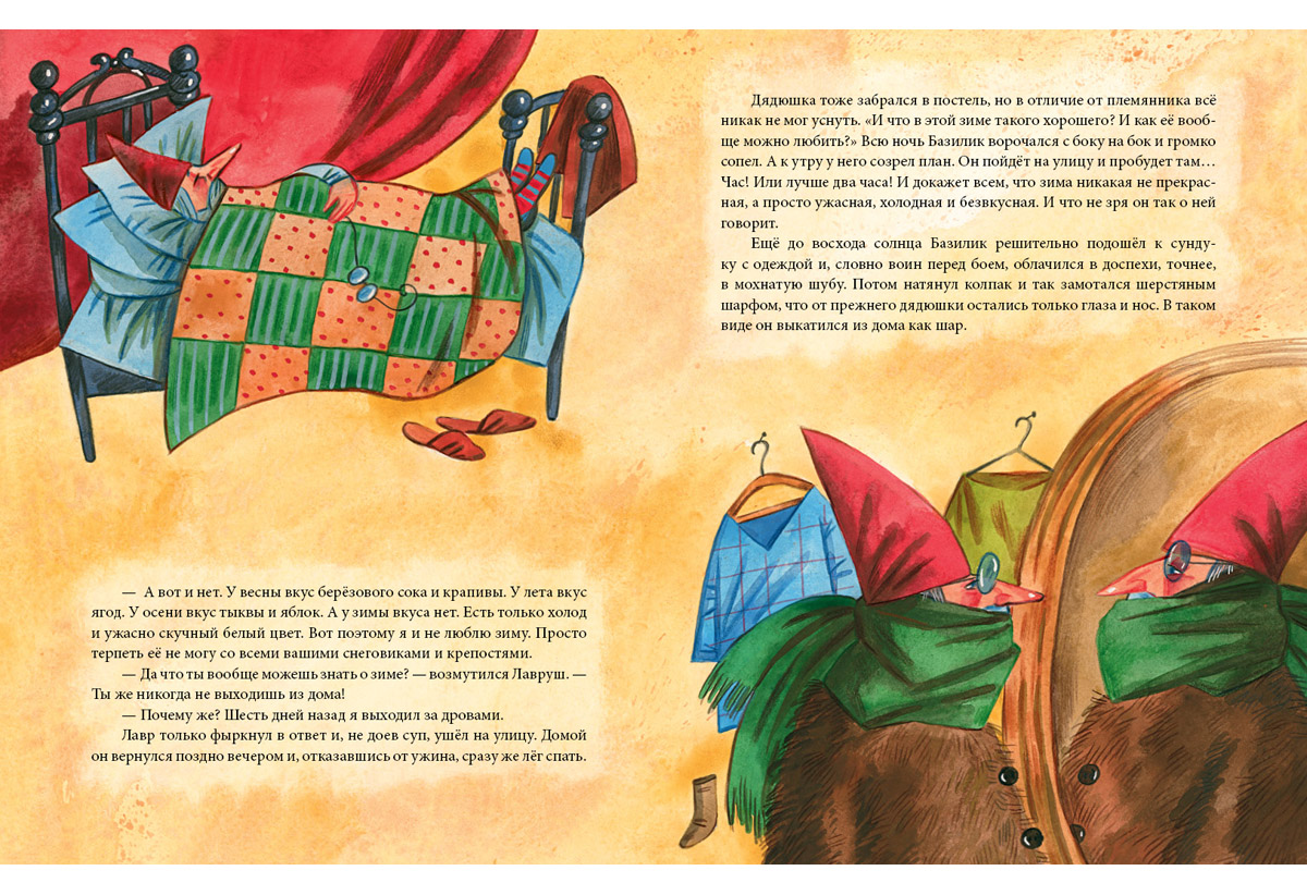КнигиКак вы думаете, какая зима на вкус? А вы когда-нибудь пробовали её? Вы лепили снеговиков или катались с горки на санках? Герой этой сказки — дядюшка Базилик — считает, что у зимы нет вкуса, а есть только холод и ужасно скучный белый цвет. И всегда с нетерпением ждёт прихода весны.