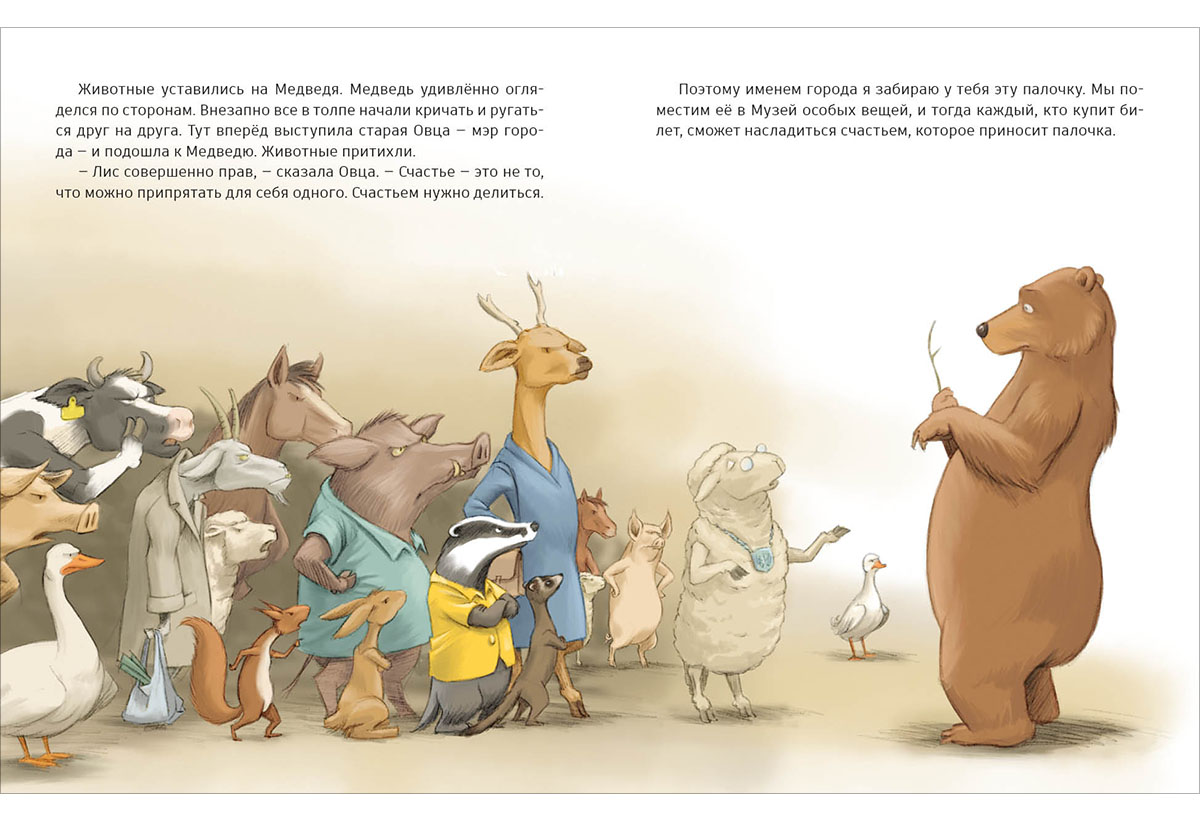 КнигиВстретились однажды очень грустный Медведь и очень счастливая Мышка. Почему же Мышка была так счастлива? Оказалось, что всё дело в СОВЕРШЕННО особенной палочке, которая делает своего обладателя счастливым. Мышке стало жаль Медведя, и она одолжила ему палочку. И тут началось такое!!! Ведь волшебная палочка понадобилась сразу всем зверям в городе…