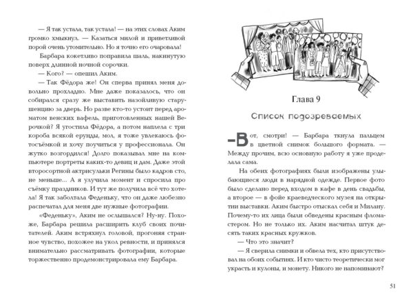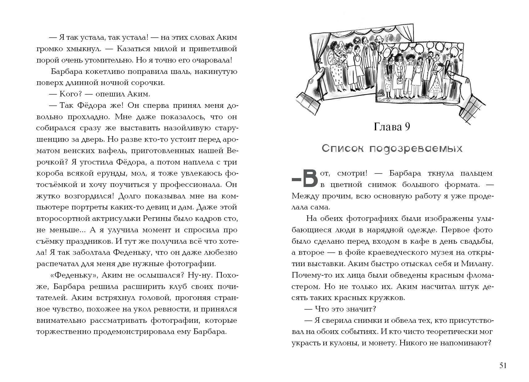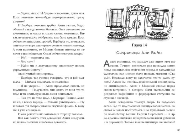 КнигиВ кафе «Книжки и кружки» сыграли свадьбу бариста Анна и её жених Роман. Эксцентричная бабушка Акима, Барбара, и его мама подарили молодым золотые кулоны с гравировкой. Но Анна не нашла их среди других подарков. Разочарованная Барбара была крайне недовольна. Она же сама выбирала этот подарок! Вскоре в городе открылась выставка с редкой старинной монетой X века. Но увы, вечером артефакт бесследно исчез прямо на глазах у посетителей! И кулоны, и монета пропали! Аким и Барбара решили провести собственное расследование. Под подозрением все, или почти все…