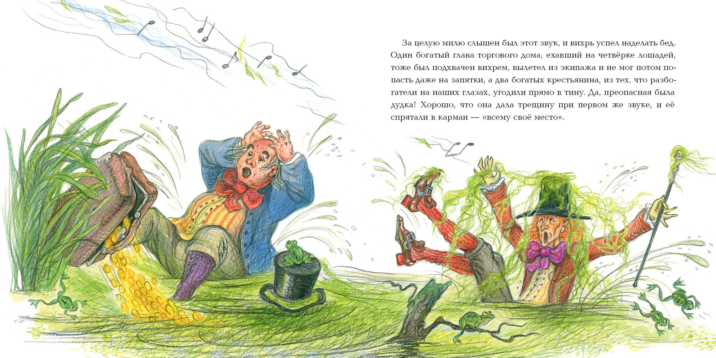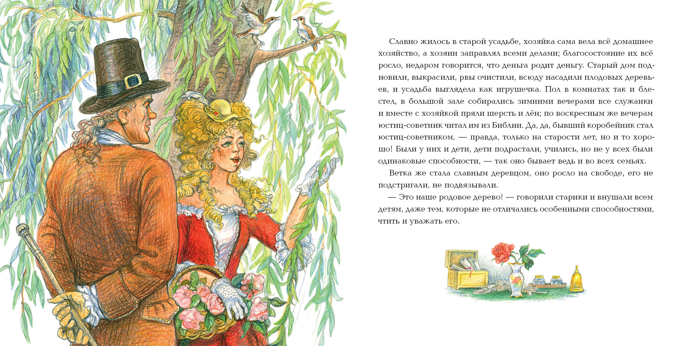 КнигиОднажды богатый охотник, проезжая через мост, столкнул в грязь юную пастушку, крикнув, что всякий должен знать своё место. К счастью, девочка успела зацепиться за ветку ивы, но отломила её. Проходивший мимо молодой коробейник подхватил пастушку, а отломанную ветку воткнул в землю, пожелав, чтобы из неё вышла хорошая дудка для господ. Коробейник разбогател, выкупил усадьбу разорившегося барина и женился на бывшей пастушке. Их потомок получил баронский титул. Шли годы, и через сто лет семья барона почти забыла своих предков. Но однажды в усадьбе на балу заиграла дудка, вырезанная из той самой ивовой ветки…