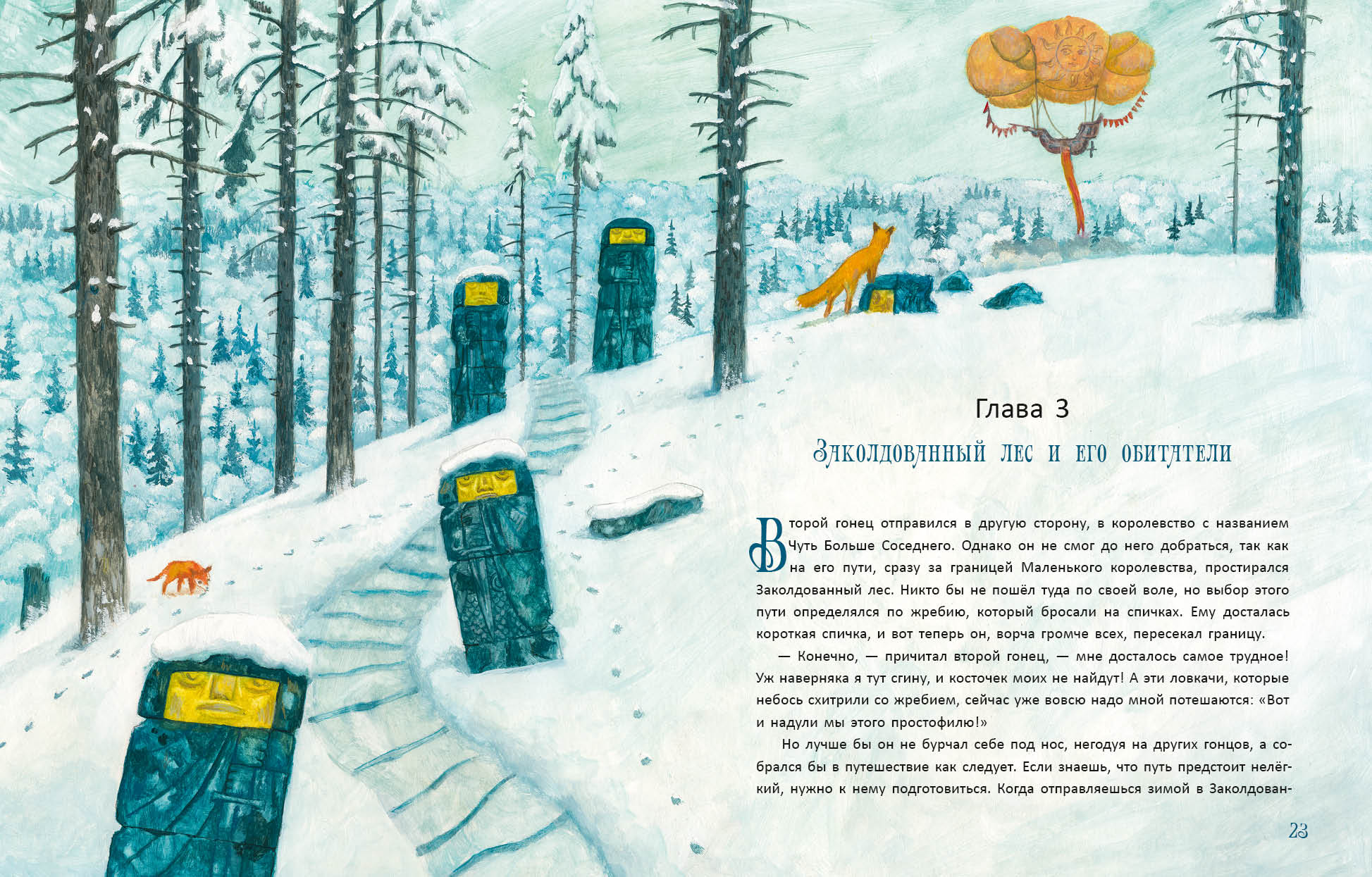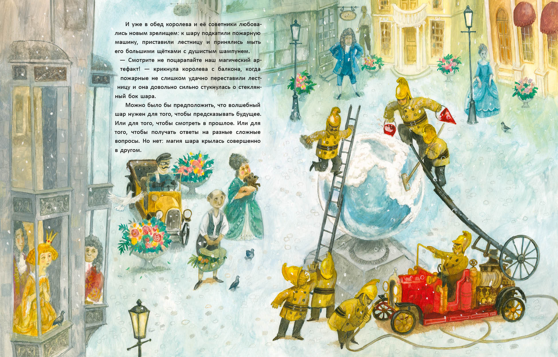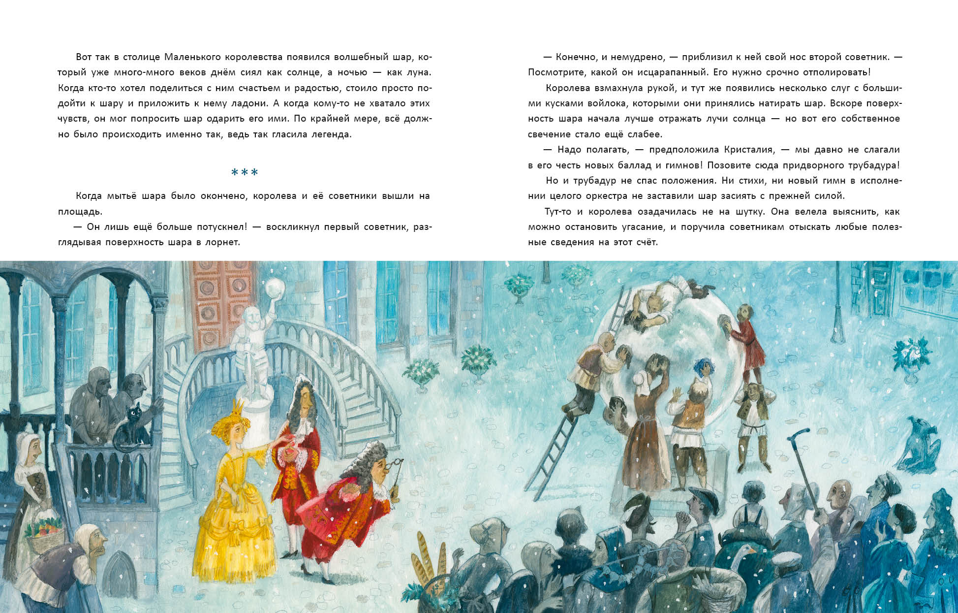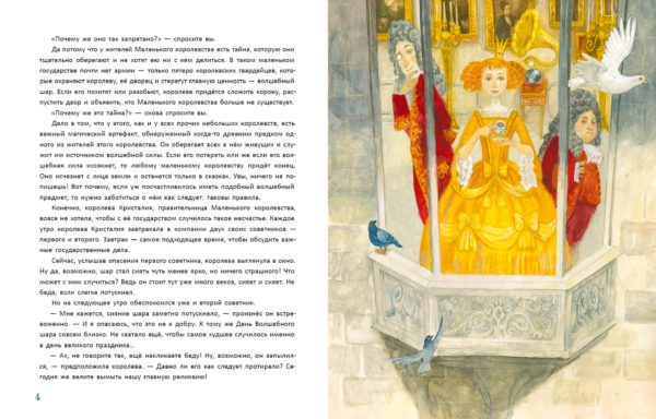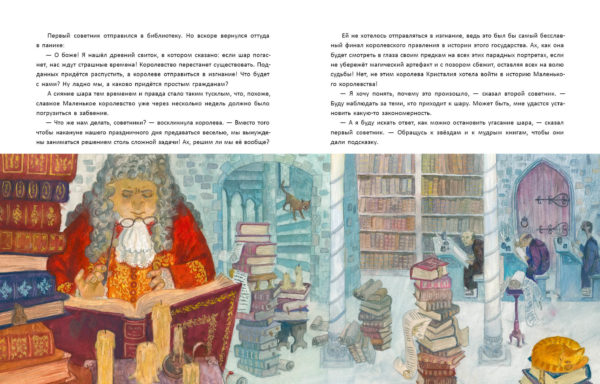 КнигиНа дворцовой площади сиял хрустальный шар — символ счастья и радости Маленького королевства. По легенде, он дарил счастье каждому, кто к нему прикасался. Но однажды советники заметили, что шар потускнел. Говорили, если он погаснет — королевство ждёт упадок. Люди же всё чаще обращались к шару лишь с жалобами и просьбами. Тогда королева велела всем делиться с ним радостью. Но как заставить людей быть счастливыми по приказу? Мудрые книги и звёзды подсказали, что счастье нужно искать не только в себе, но и в мире вокруг. Тогда гонцы отправились в дальние земли, чтобы найти радость и добро и принести их в королевство.