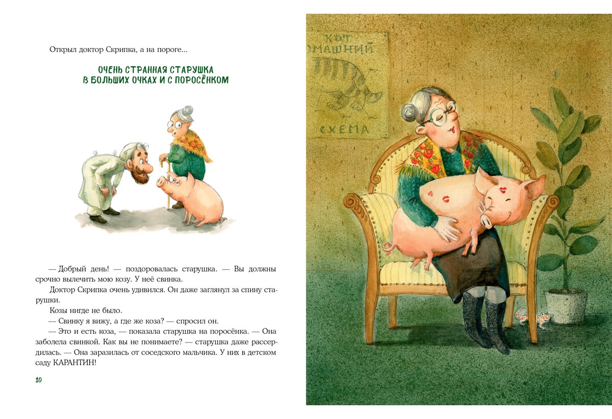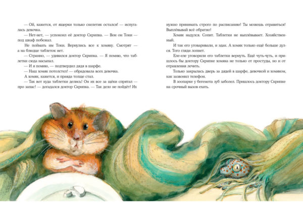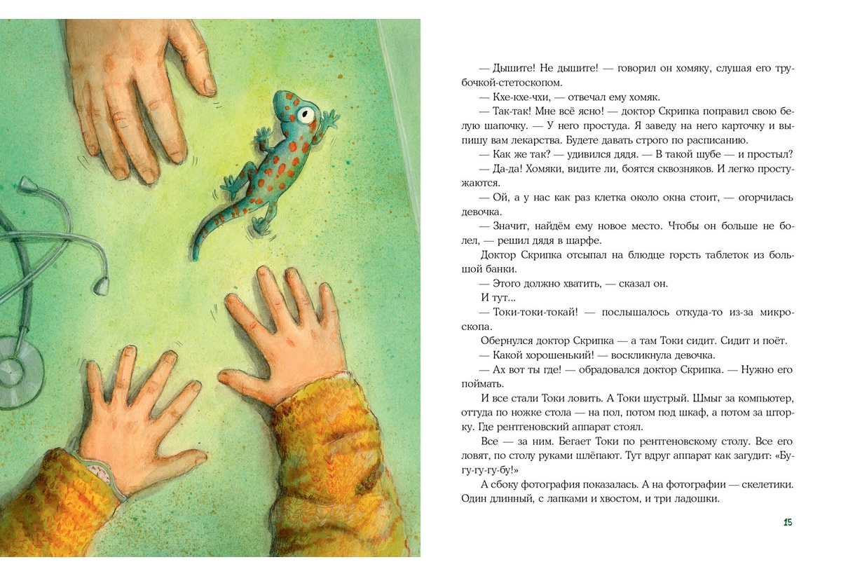 КнигиДоктор Август Скрипка — ветеринар, а это значит, что каждый день у него на работе случается что-то необычное! То хомяк чихает, то кот-рыболов в банке застрянет, то коза оказывается поросёнком… А сегодня доктор нашёл на пороге кабинета загадочную коробку с необычным гостем — ящеркой в рыжую крапинку по имени Токи. Доктор Скрипка и его посетители будут искать и ловить юркого Токи, пытаясь разгадать загадку: откуда же он всё-таки взялся… и кто он?