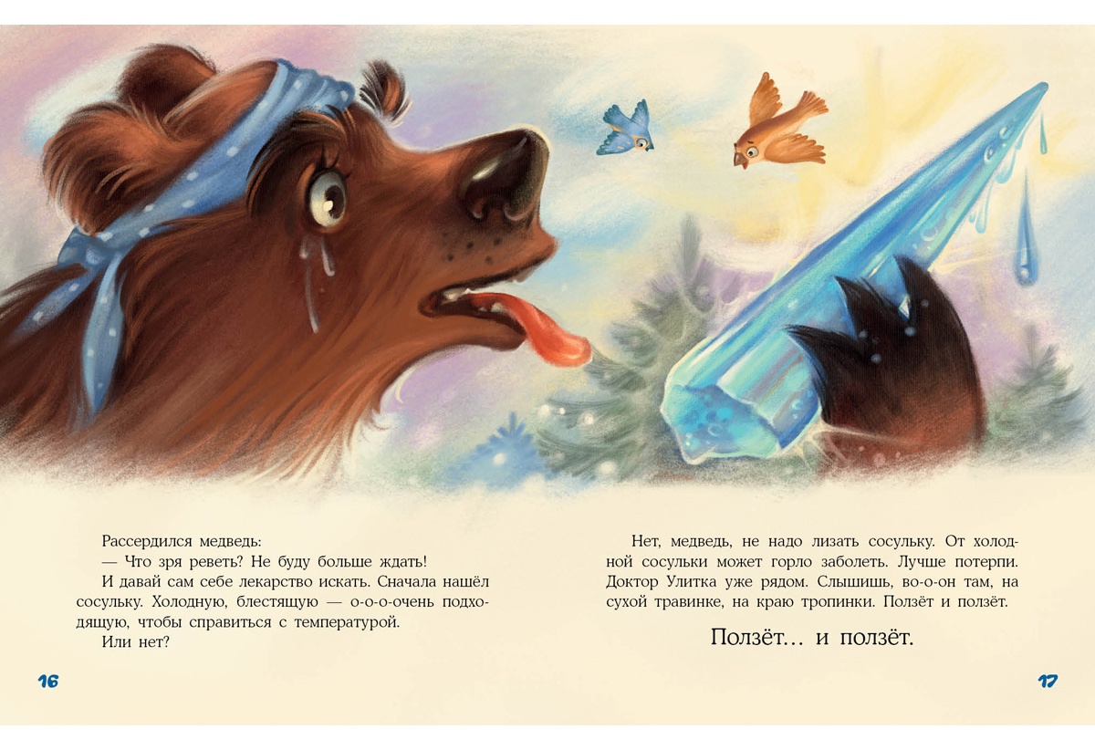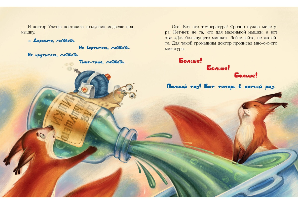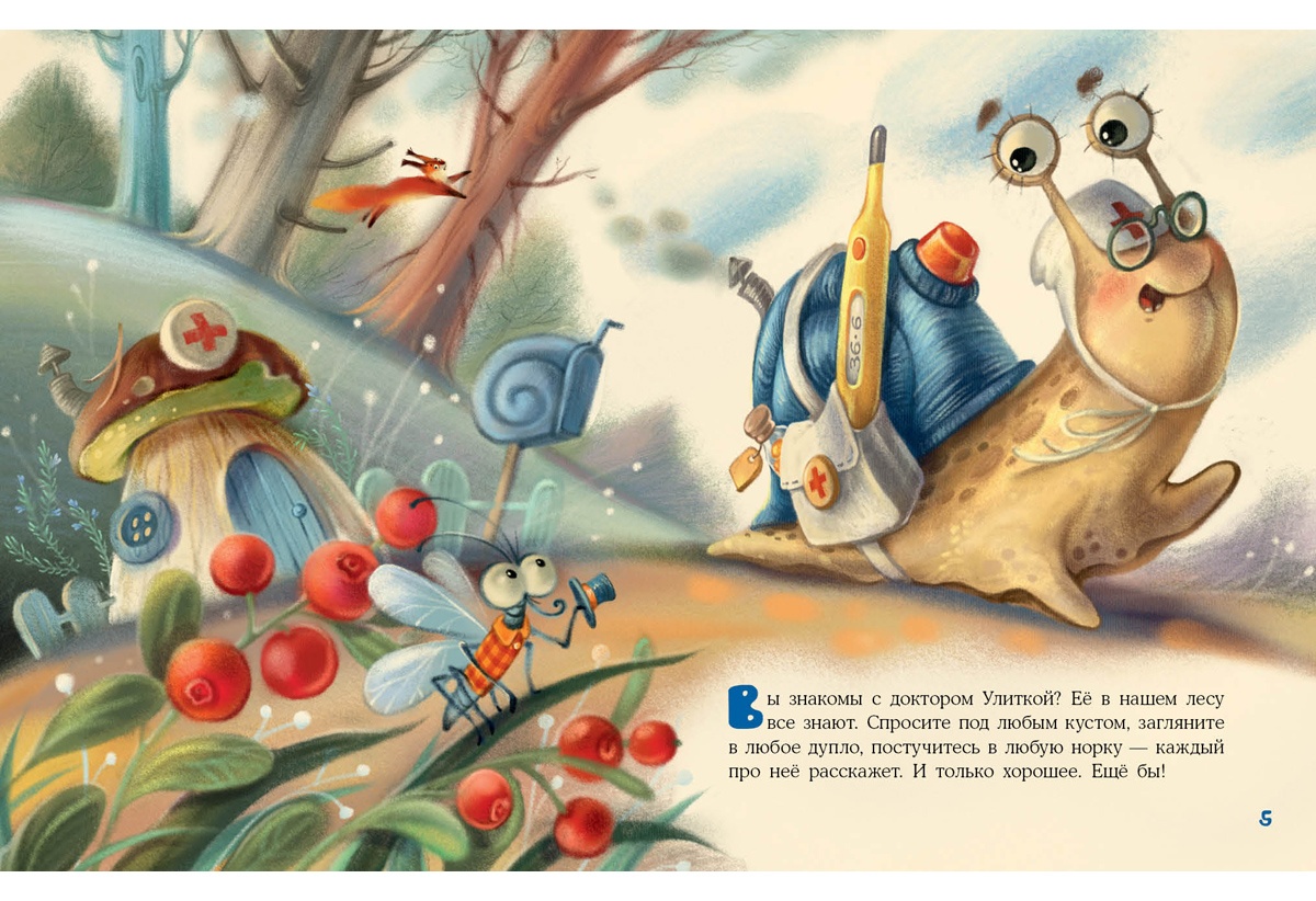 КнигиДоктора Улитку знает каждый лесной житель! Она и занозу из носа у волка вытащила, и ёжику все больные иголки вылечила, а теперь спешит-ползёт к медведю — у бедняги сильный жар- До берлоги путь небыстрый — с пригорка на горку, с листочка на кочку, — но чудесный доктор обязательно доберётся и поможет мохнатому пациенту!
