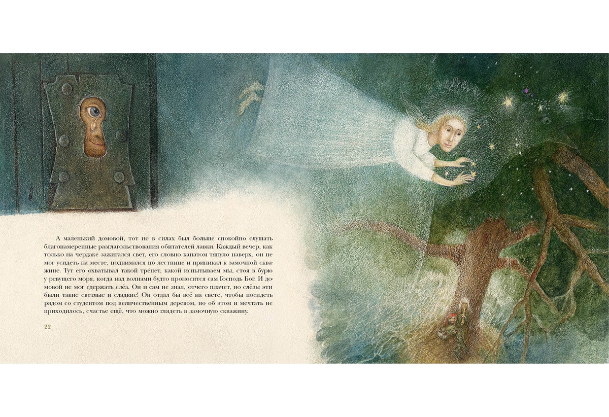КнигиДомовой обитает в доме у лавочника. Тот угощает его кашей с маслом каждый сочельник — чего ещё можно желать для счастья? Но вот однажды в лавку приходит бедный студент и вместо еды покупает- старую книжонку стихов. Чем же стихи лучше, чем свежий кусок сыра? И что значит — разбираться в поэзии? Любопытный домовой хочет понять, и его ожидают чудесные открытия…
