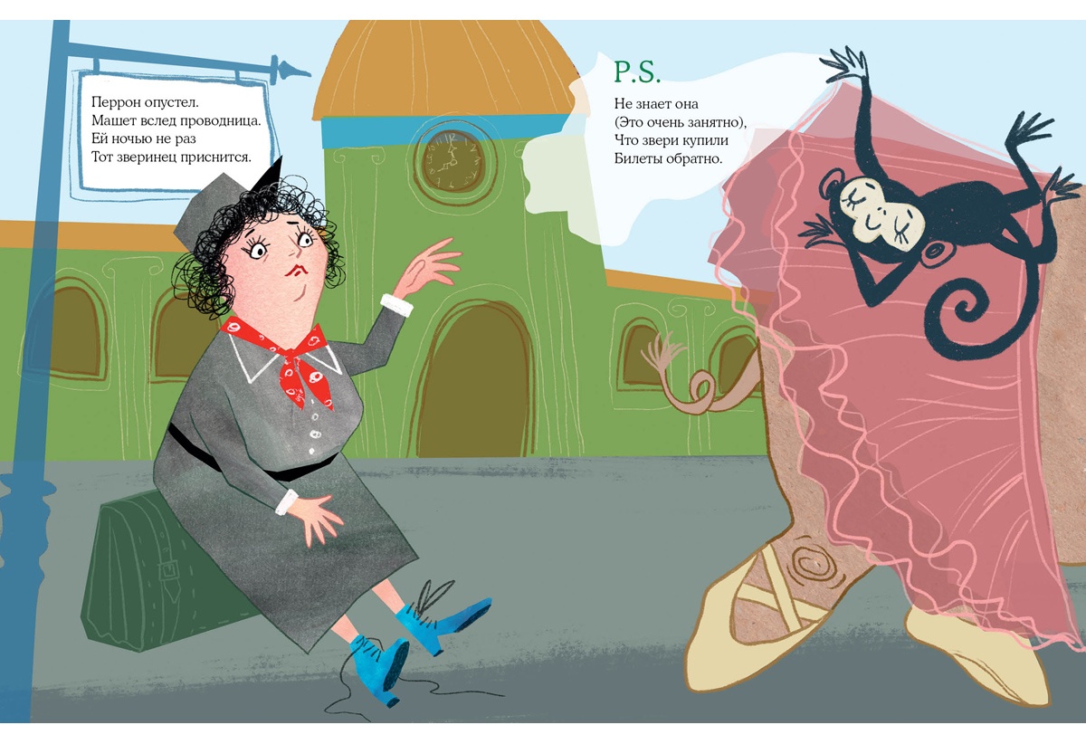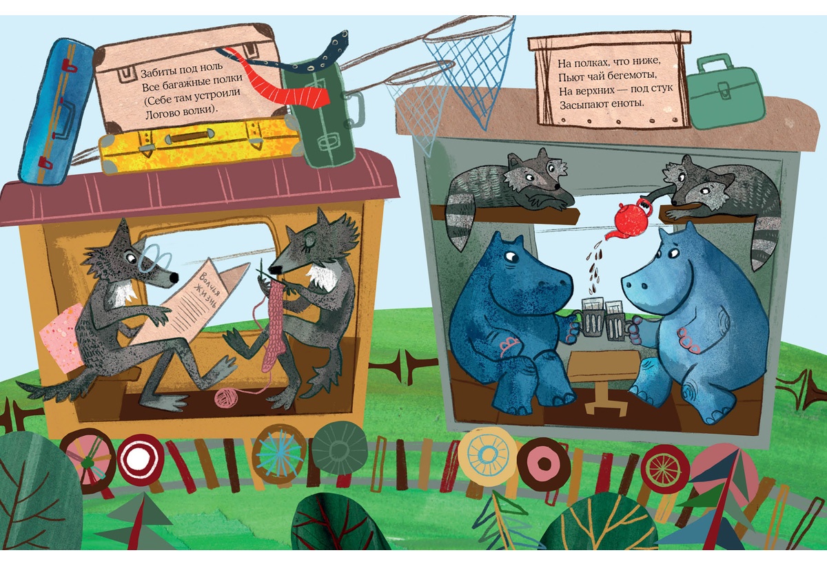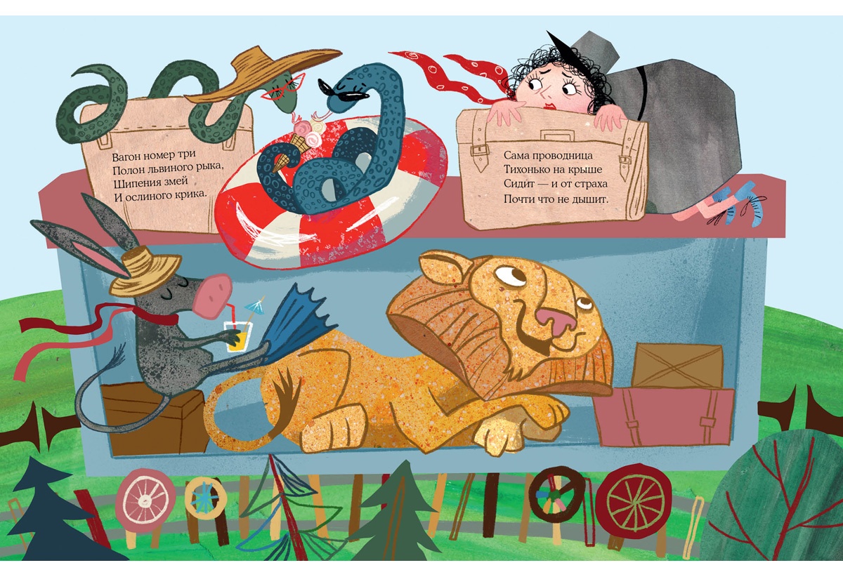 КнигиПроводница напугана не на шутку — поезд битком набит зверями. Повсюду койоты, еноты, волки, львы, тигры и змеи, в тамбуре — пантера, а слониха застряла в проходе шестого вагона. Весёленькая предстоит поездка!