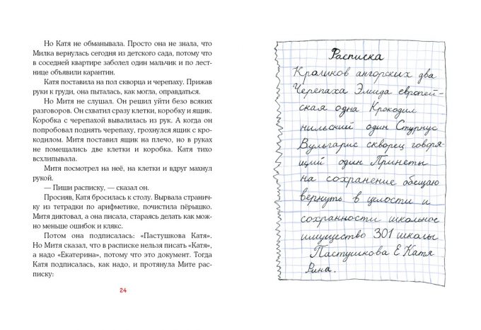 КнигиОднажды Катя Пастушкова встречает на улице мальчика Митю, который доверяет ей своего крокодила и животных из школьного живого уголка — двух ангорских кроликов, скворца и черепаху эмиду европейскую. Никто и подумать не мог, что животные разбегутся и начнётся самый настоящий переполох.