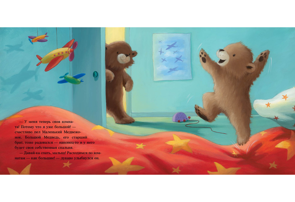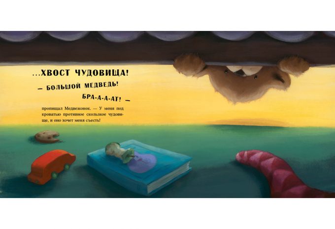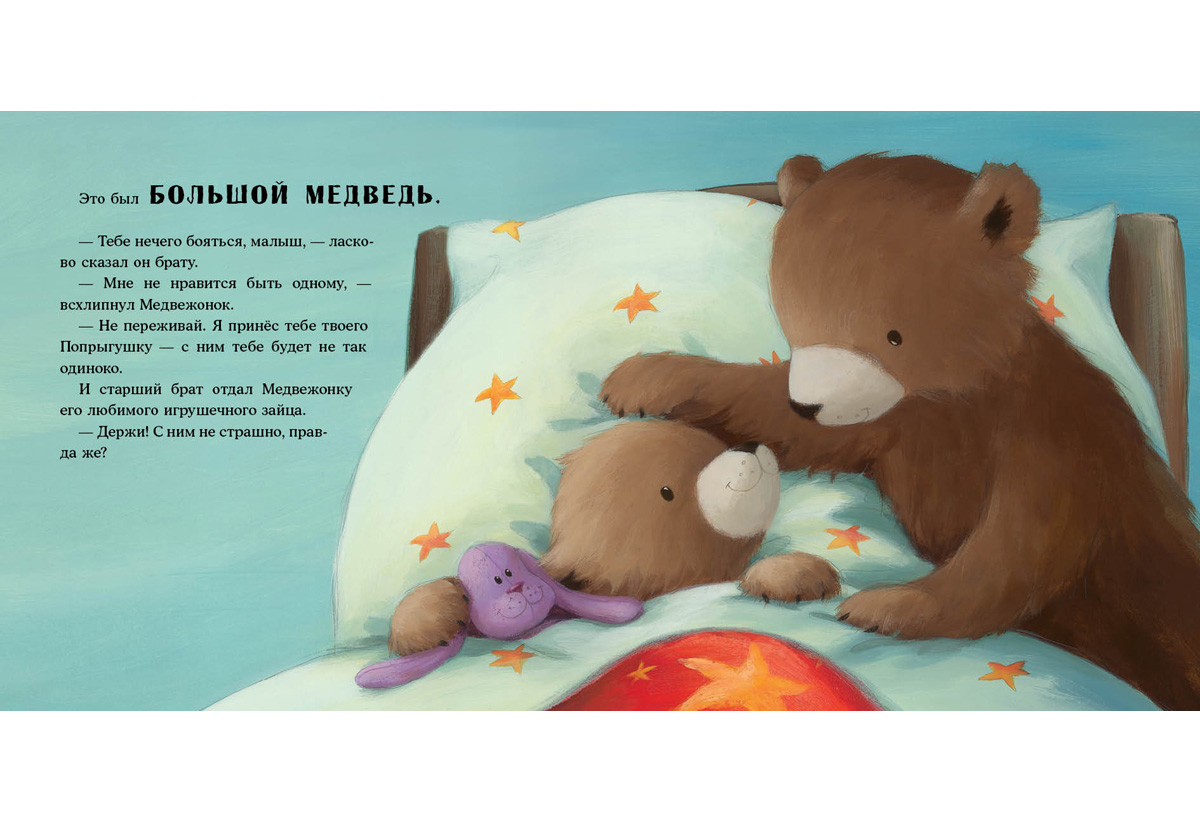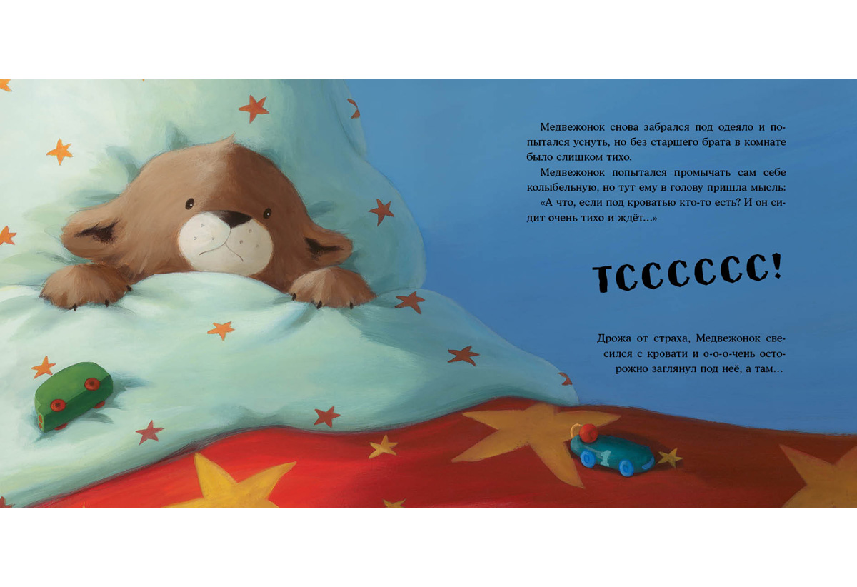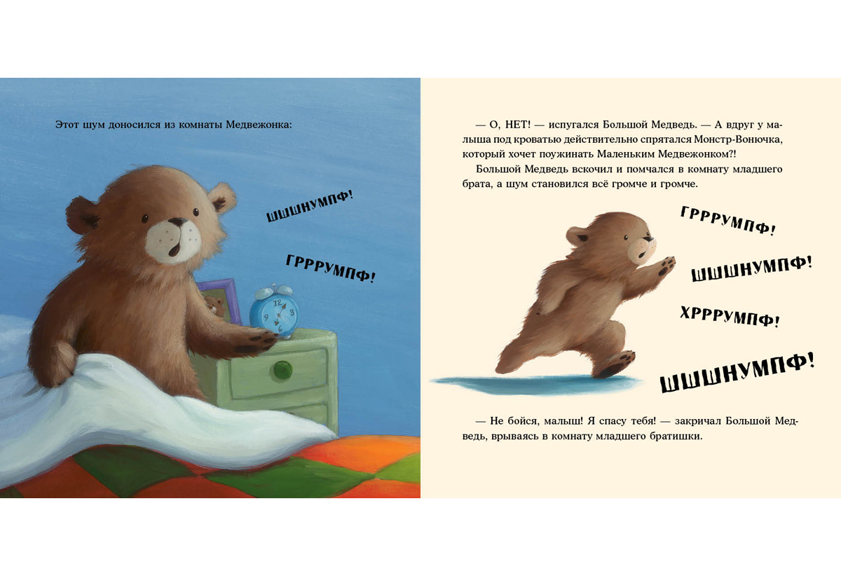 КнигиМедвежонок очень волнуется! Сегодня он в первый раз в жизни будет спать один, в собственной комнате. А без старшего брата как-то страшновато. Как только гаснет свет, шорохи и тени наполняют комнату, а под кроватью, кажется, прячется… монстр! И он наверняка пришёл, чтобы слопать Медвежонка!