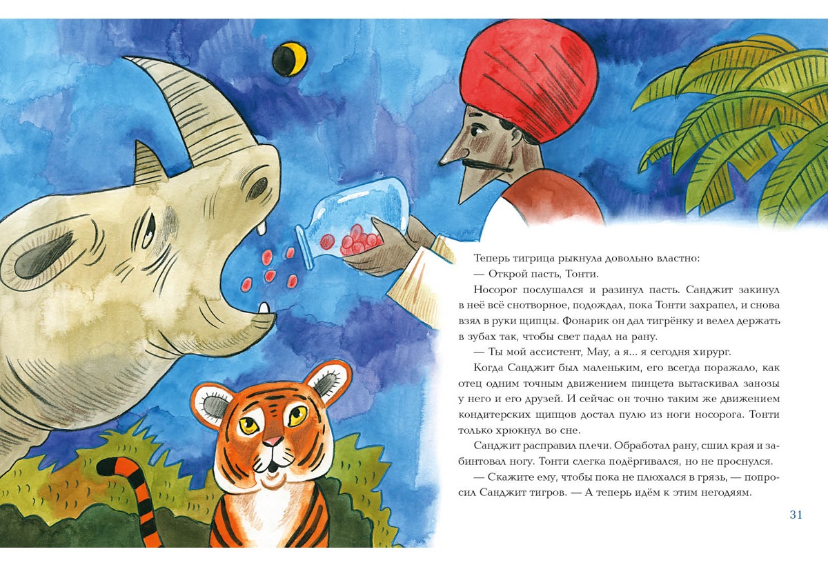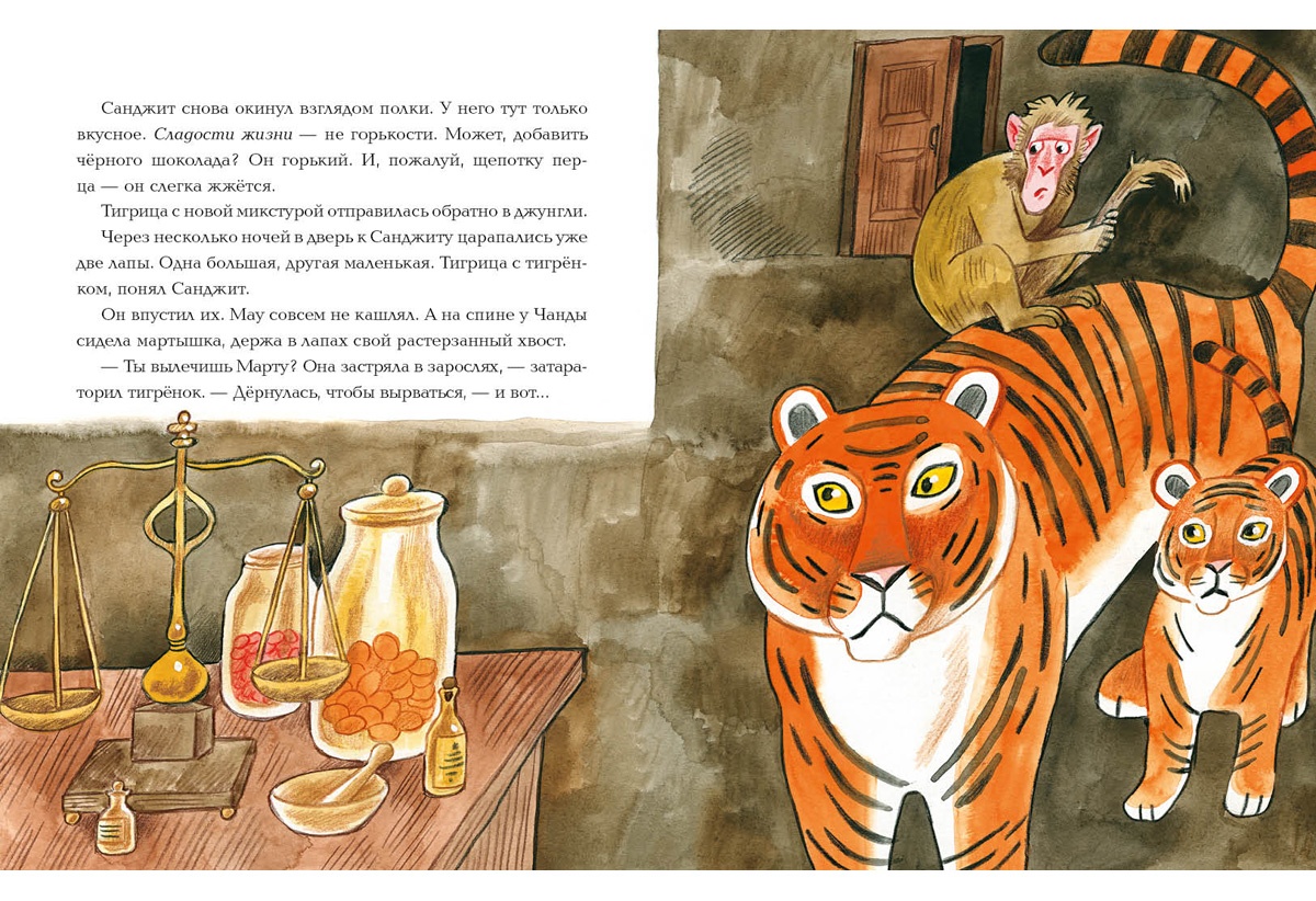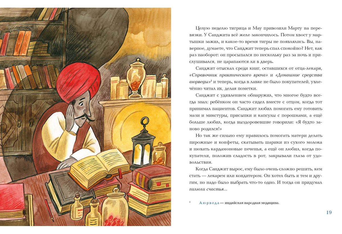 Книги«Лекарь Санджит Ваманкар» — так гласит надпись на доме в маленьком индийском городке. На самом деле Санджит никакой не лекарь — вывеска осталась от отца, а сам он работает кондитером. Но когда на пороге его лавки появляется грозная тигрица и просит лекарство для своего тигрёнка, испуганный Санджит не решается отказать- А что если приготовить целебный сироп из полезных ингредиентов для сладостей?