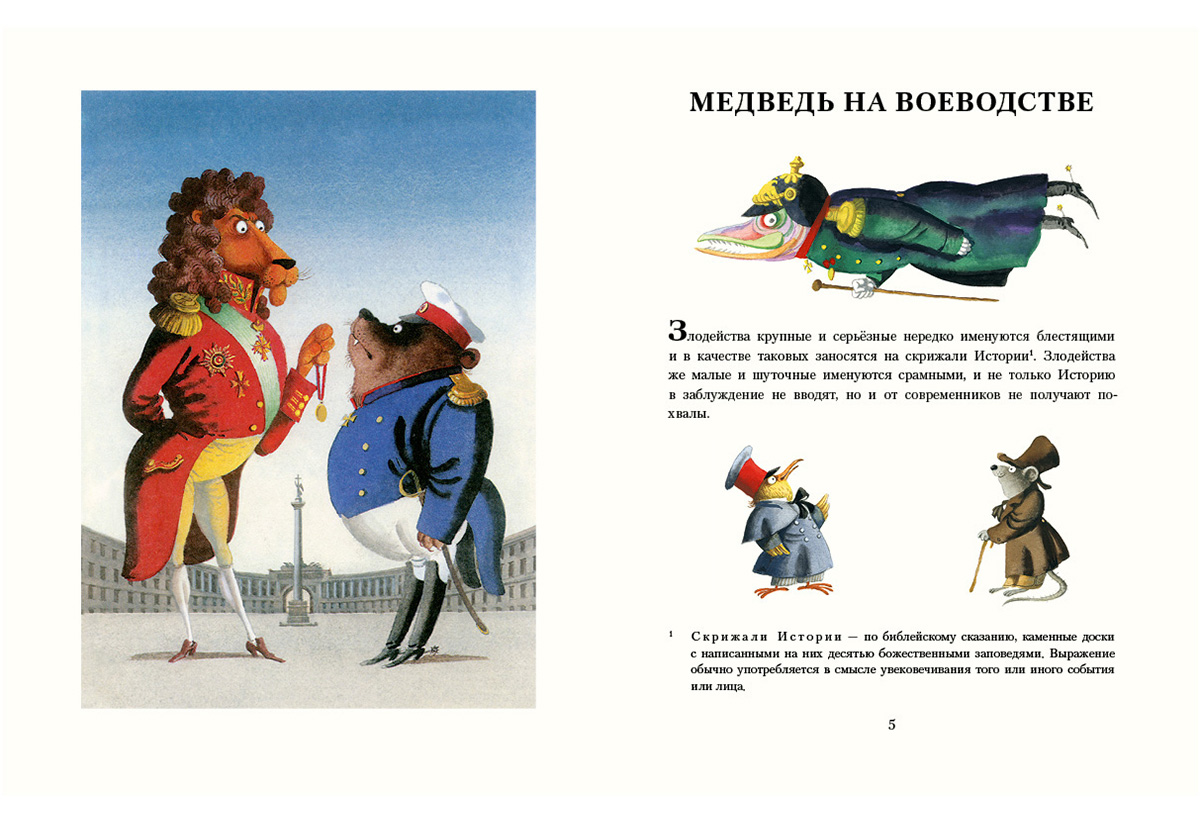 В книгу вошли три сказки: «Медведь на воеводстве», «Орёл-меценат» и «Карась-идеалист». В сказках о животных автор иносказательно изображает типичные пороки общества – глупость, чванство и казнокрадство власть имущих, лень и необразованность чиновников, произвол и пренебрежительное отношение к простым людям. С помощью сатиры и иронии писатель пытается не только открыть читателю глаза на эти проблемы, но и даёт свой рецепт выхода из сложившейся ситуации. Такие произведения не дают злу взять верх над добром, помогают бороться с несправедливостью и верить в то, что победа всегда будет за правдой.
