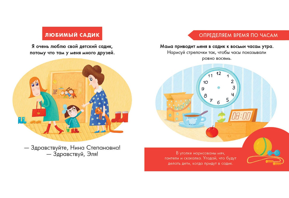 КнигиВ книжке «Мой любимый детский сад» вместе с девочкой Элей малыши научатся определять время по часам, поиграют в «шляпу», составят распорядок дня, найдут способ победить назойливого монстрика и решат логические задачки. В нашем детском саду никому не будет скучно.