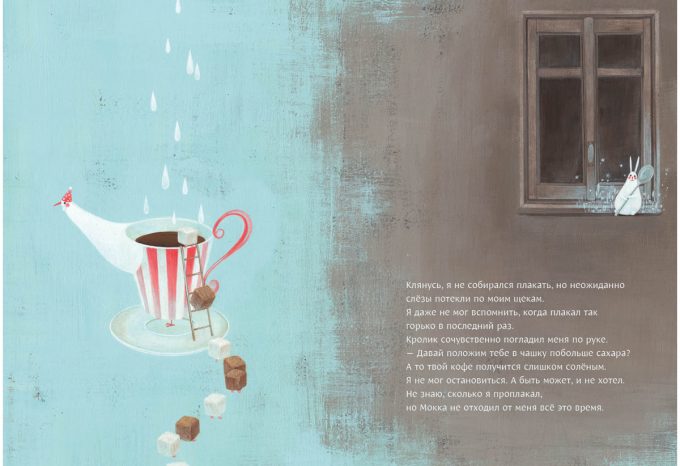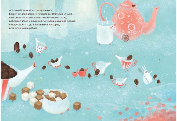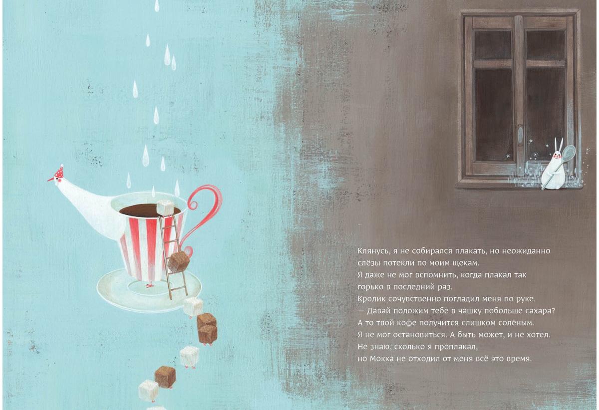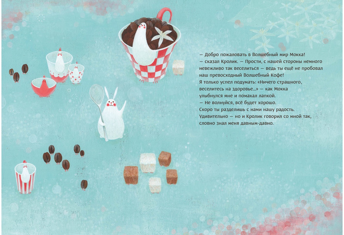КнигиНа страницах книги оживает невероятно ароматный мир — волшебный мир кофе. Здесь вы встретите необычных чашек-птичек и длинноносых кувшинчиков для молока, смеющихся кофейных зёрен и забавных кубиков сахара, увлекающих своего читателя в весёлый хоровод. Главный герой этого удивительного мира — очаровательный Кролик Мокка, выдуманный маленьким мальчиком когда-то в детстве.
