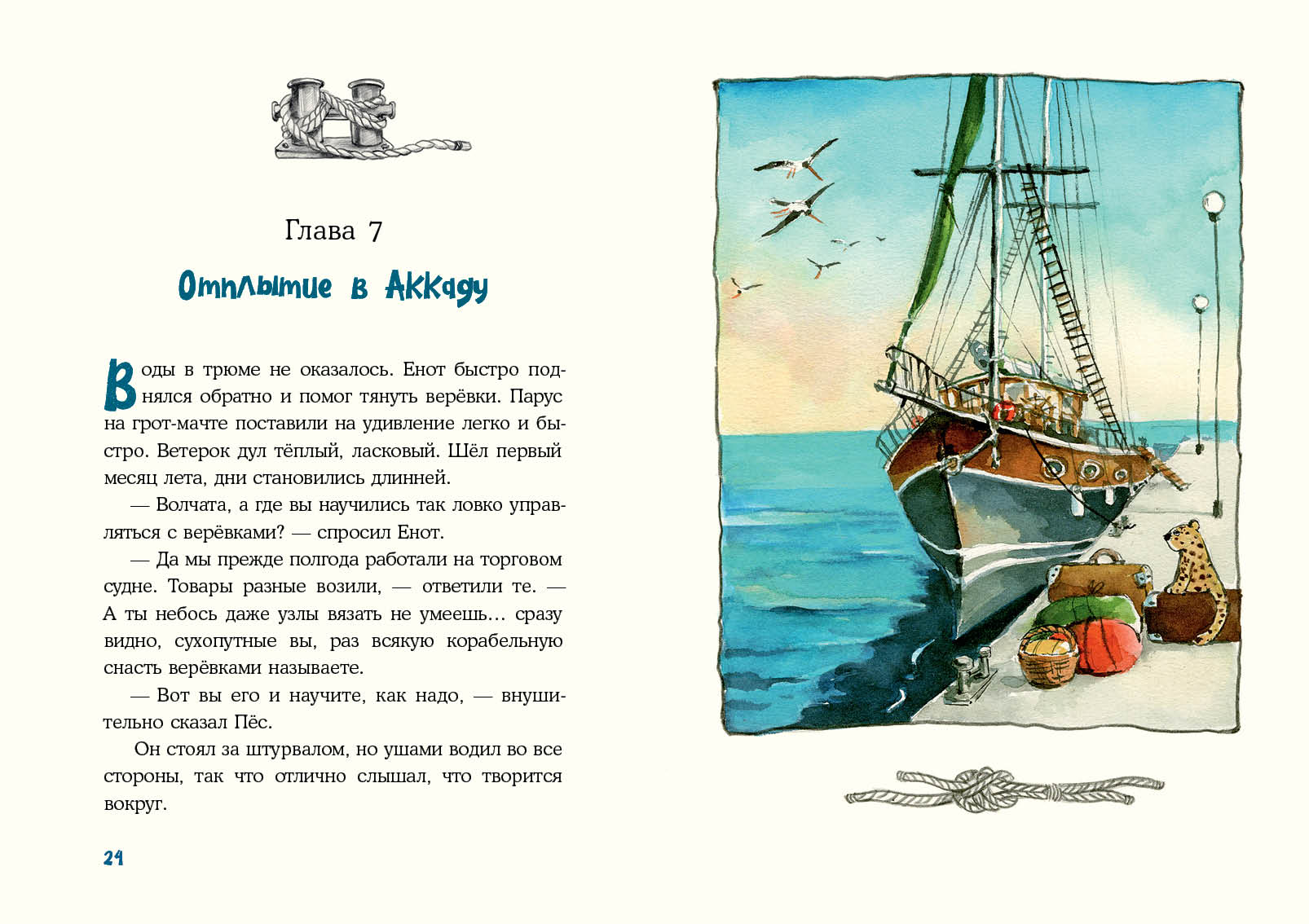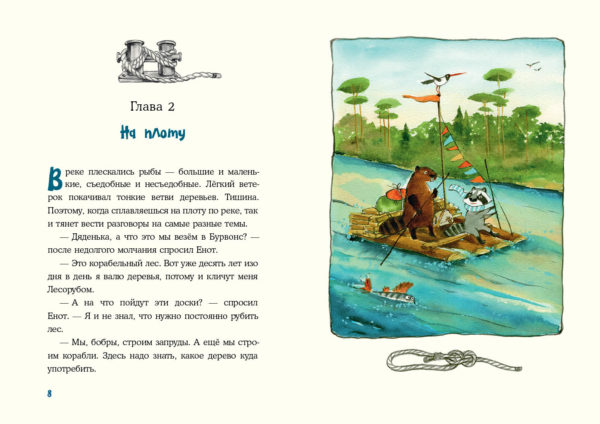 Енот Кисточка (так его прозвали на корабле) научится определять стороны света, вязать узлы и обращаться с парусами. Вместе с командой будет добывать питьевую воду и отличать съедобных рыб от несъедобных (по разумному взгляду)- В этом увлекательном путешествии Енот найдёт настоящих друзей — и, конечно, увидит удивительные и загадочные дальние края!