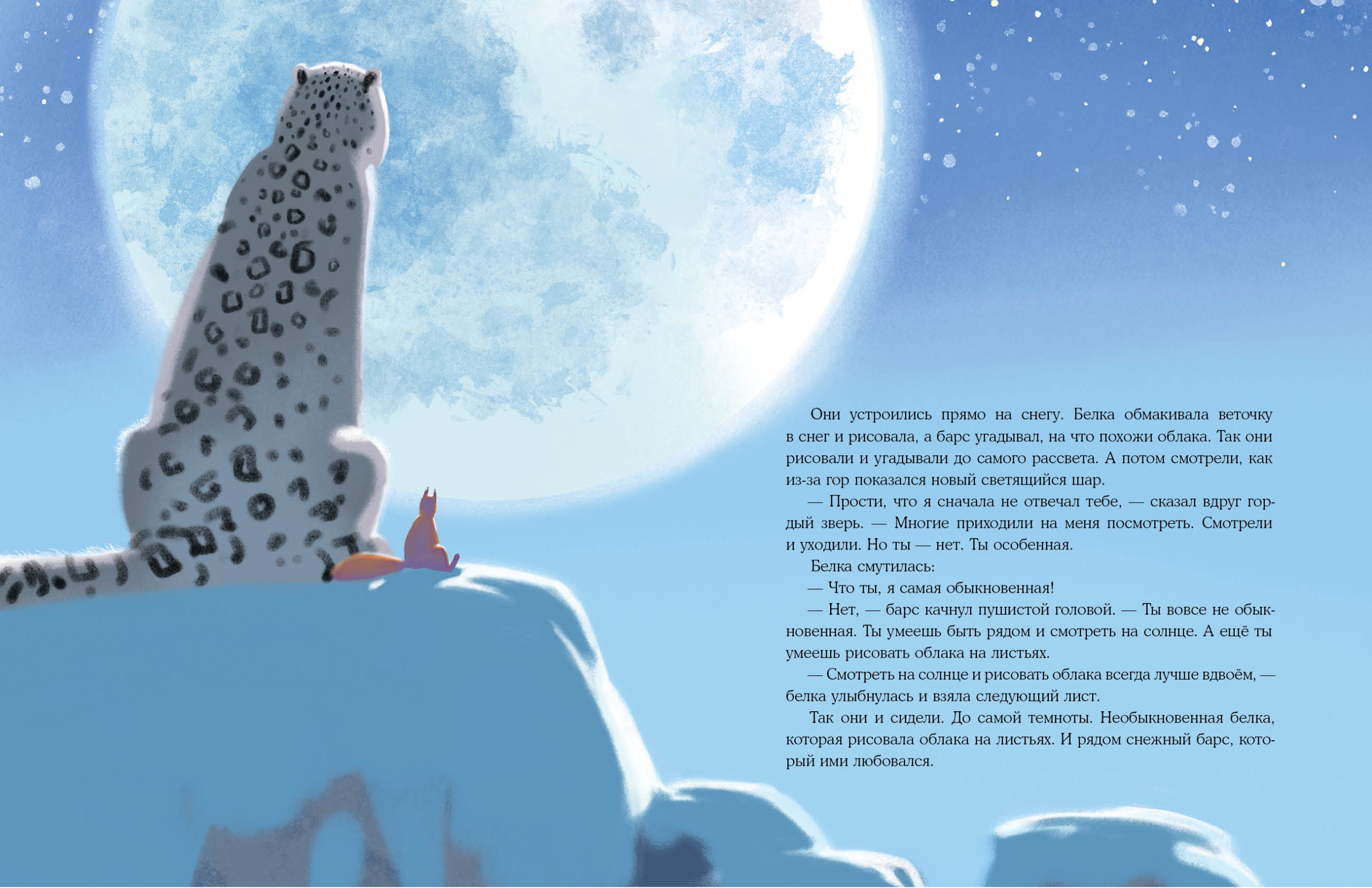 КнигиВсе лесные звери были ужасно взволнованы: в горах поселился снежный барс! Кругом только и разговоров было, что о его появлении, а маленькой белке ужасно захотелось с ним познакомиться. Правда, когда она добралась до жилища барса, выяснилось, что одинокий гордец не обращает на неё никакого внимания. И всё-таки маленькая белка стала приходить на гору каждый день. Она сидела рядом с барсом, пока тот любовался заходящим солнцем, а однажды принесла с собой дубовые листья и стала рисовать на них облака, напевая себе под нос…