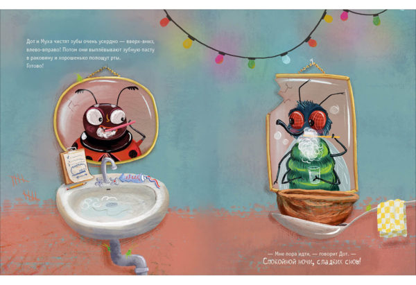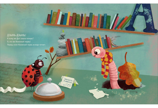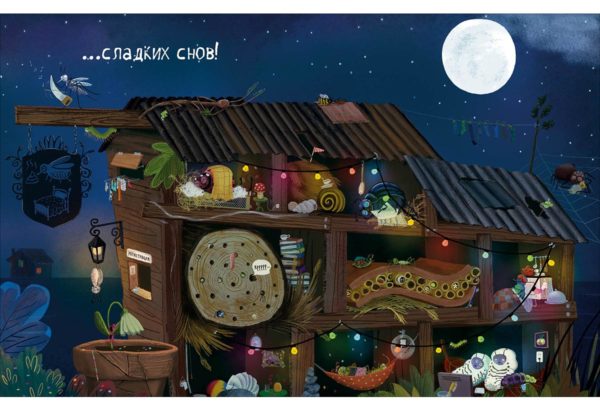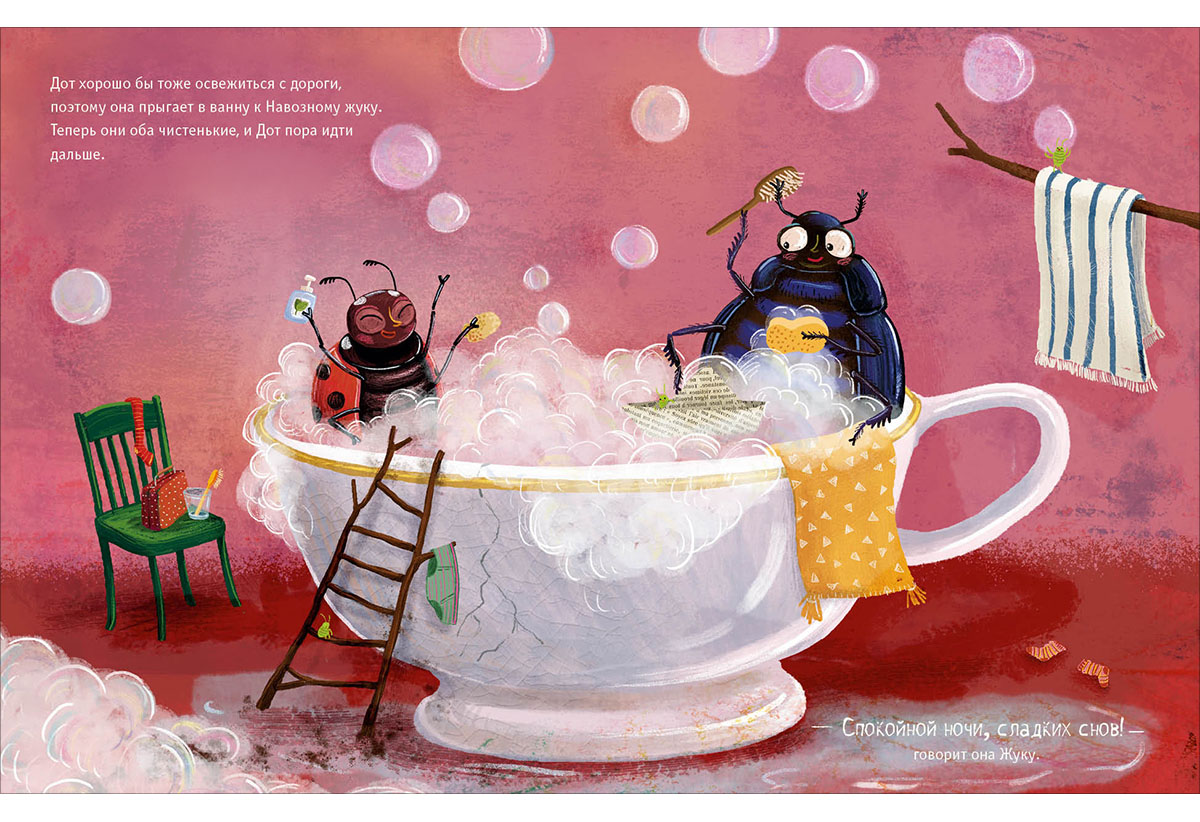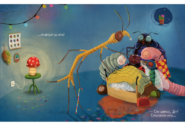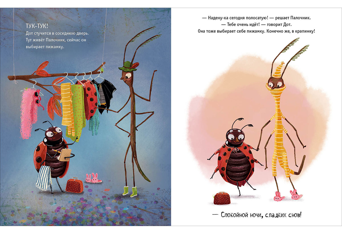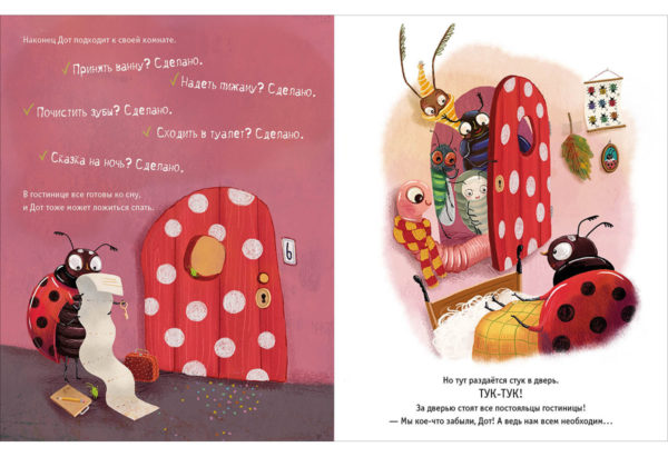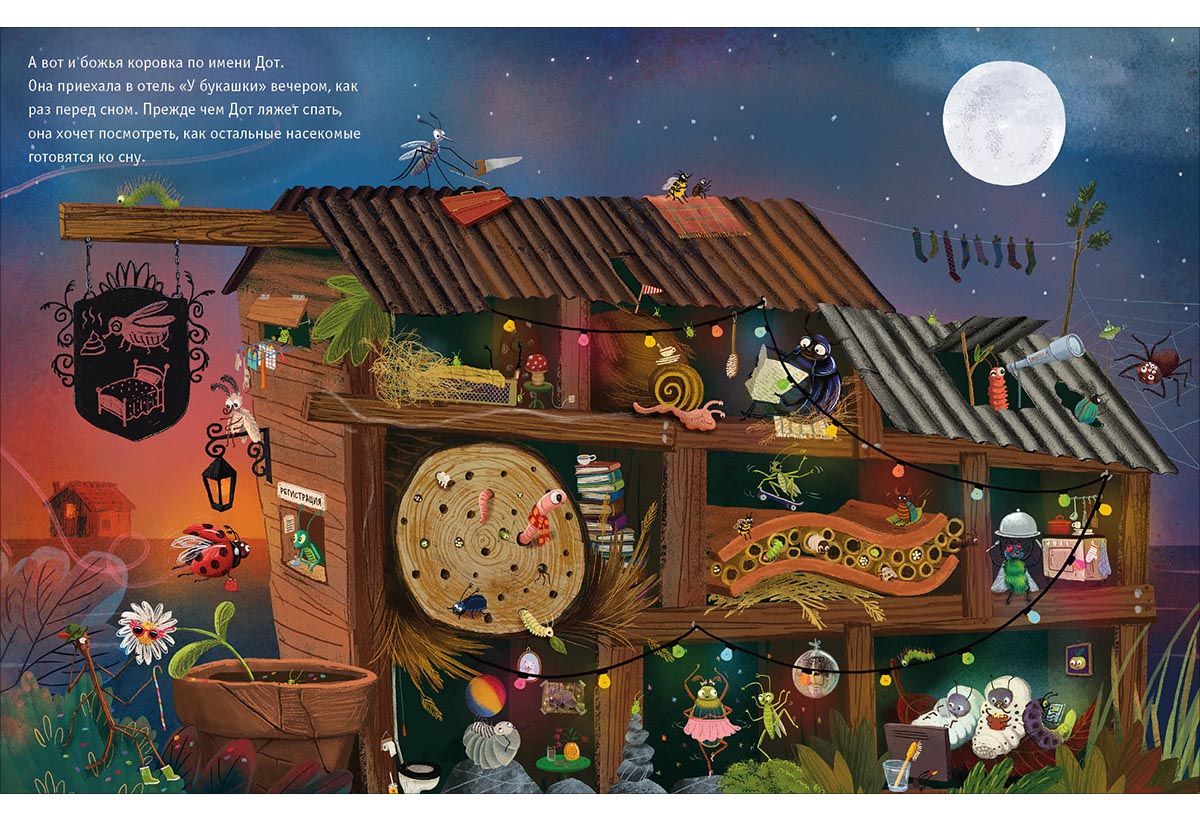 КнигиБожья коровка по имени Дот прибывает в гостиницу «У букашки» и собирается лечь спать, но прежде она хочет узнать, как готовятся ко сну остальные постояльцы. Любопытная Дот заглядывает к соседям: кто-то принимает ванну, кто-то чистит зубы, кто-то надевает пижаму, а кто-то читает перед сном. Но все-все хотят, чтобы им пожелали спокойной ночи.