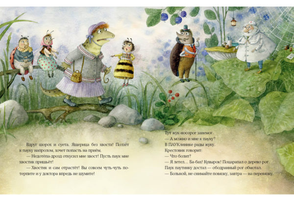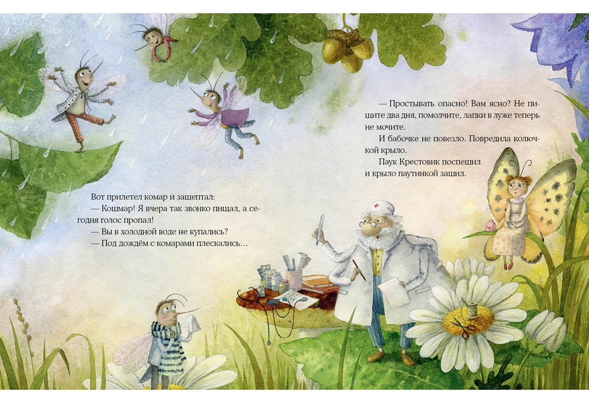 КнигиГерой этой замечательной истории — учёный паук. Он открыл свою ПАУКлинику на лесной поляне и всех-всех-всех зовёт на приём. Вот только букашки и жучки боятся идти лечиться к пауку! Но однажды у маленькой мушки разболелось мохнатое брюшко — и как она ни боялась, как ни сопротивлялась, а к доктору лететь пришлось-