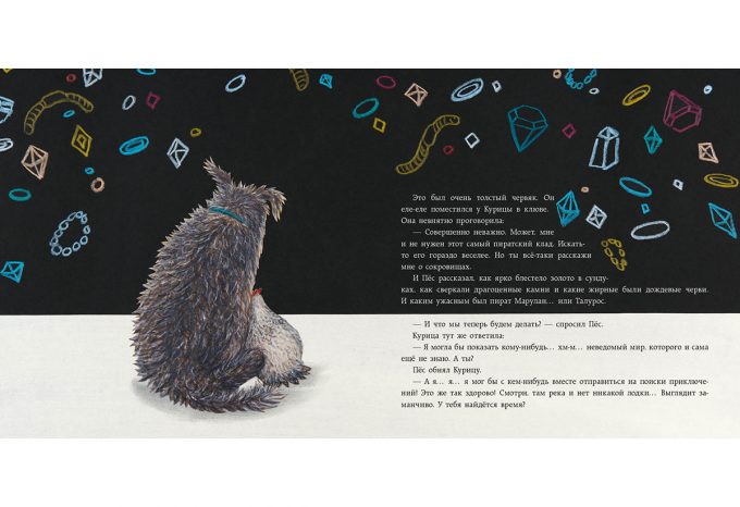 КнигиКурица часто думала о настоящих приключениях и пиратском кладе, а Пёс — о верном и понимающем друге. Они решают помочь друг другу и вместе отправляются на поиски своей мечты. Курица ищет друга для Пса, а Пёс придумывает для Курицы всякие опасности. Поймут ли герои, в чём же заключается их настоящая мечта?