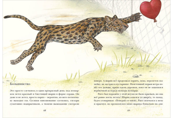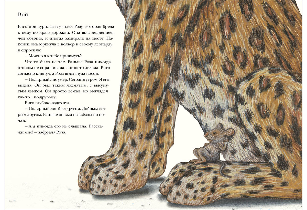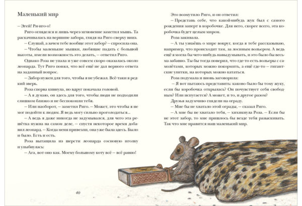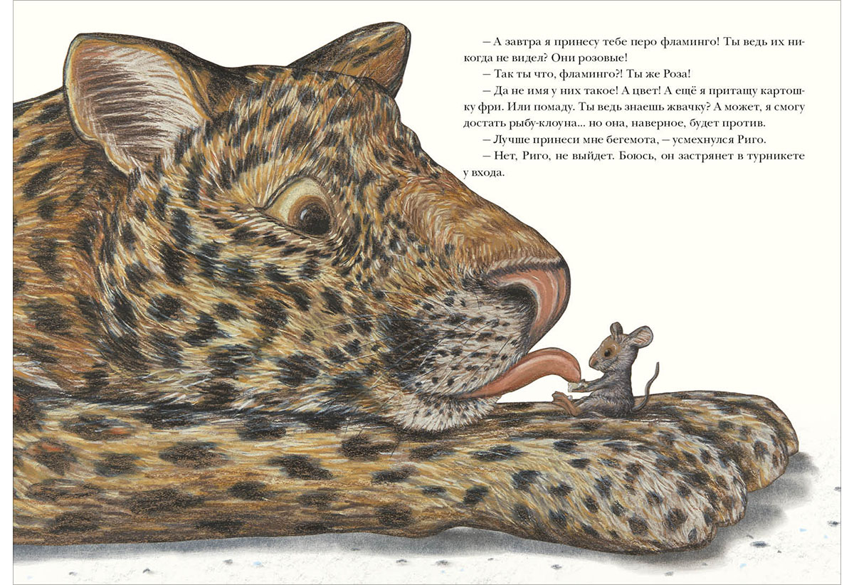 КнигиЛеопард Риго и мышка Роза живут в зоопарке. Они большие друзья. Роза всегда может положиться на Риго, ведь старый леопард — отличный слушатель. А Риго наслаждается временем, проведённым рядом с Розой, — с тех пор, как она появилась в его жизни, мир каждый день кажется ему новым. Вместе они размышляют о стихах и картинах, о счастье и несчастье, о прыгающих деревьях и своевольных тенях и о многом, многом другом. Шутка и серьёзность в этих историях ходят рука об руку, как мышь с леопардом. Удивительные истории, неожиданные вопросы и необычные ответы ждут читателей в новых приключениях Риго и Розы.