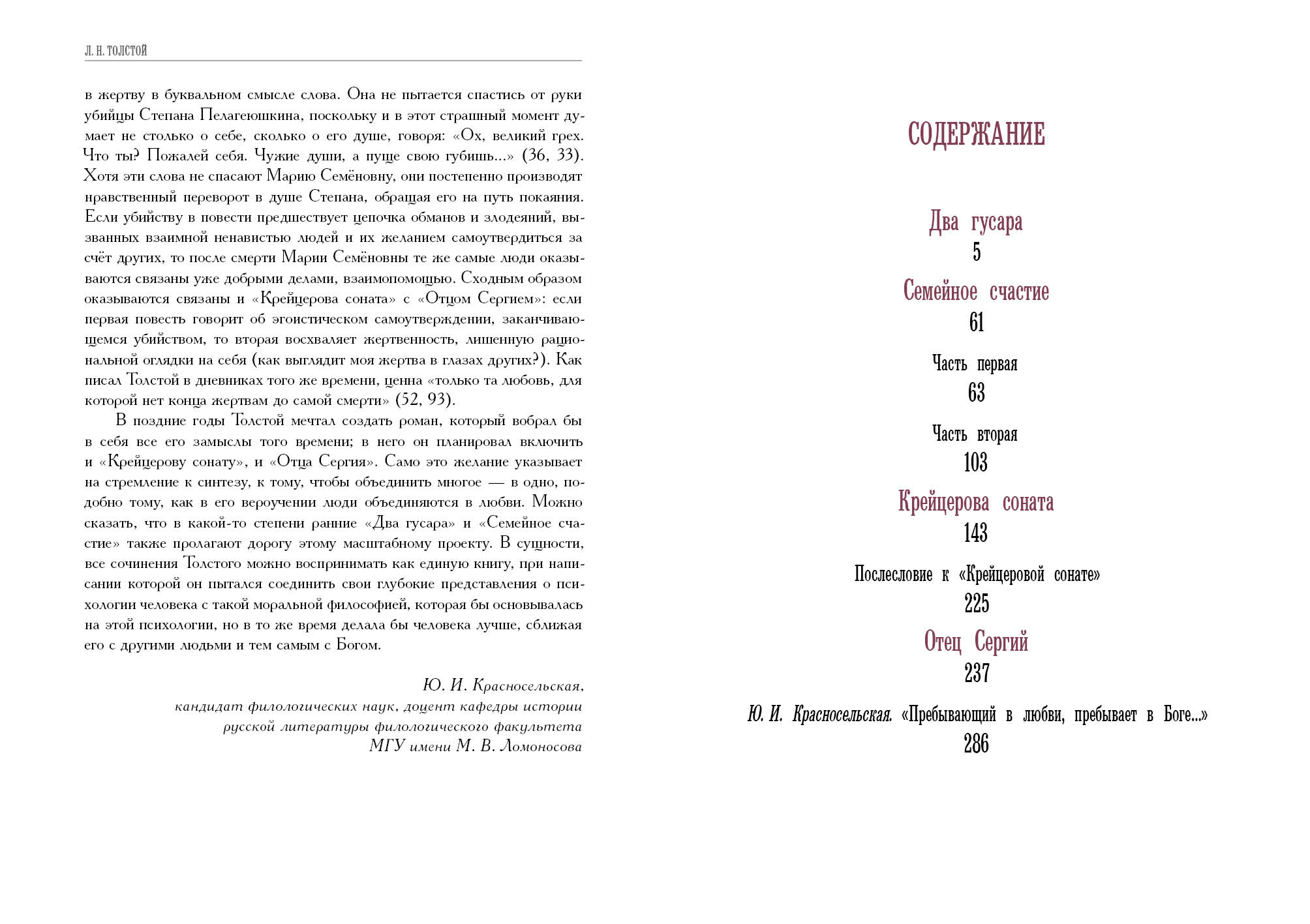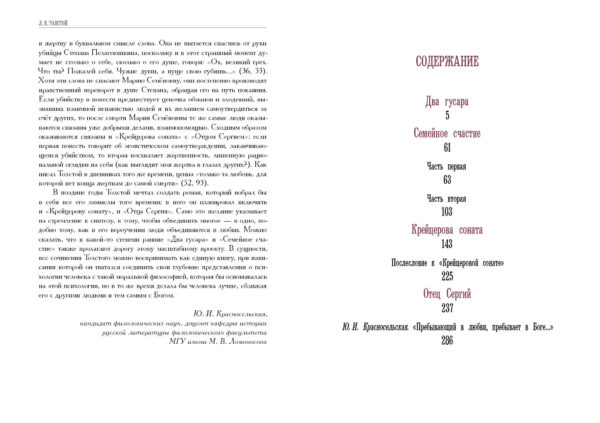 Произведения Толстого, вошедшие в настоящее издание, написаны в разное время, но объединены темой любви во множестве её проявлений и состояний. На примере героев повести «Два гусара» — представителей двух поколений семьи графов Турбиных — мы видим, как менялись общественные нравы и тип личности «героя времени». Роман «Семейное счастие» — трогательная и искренняя история девушки Маши — раскрывает перед нами мечты героини о романтической любви и те перемены, которые происходят в ней после замужества. Героя повести «Крейцерова соната» Василия Позднышева неудавшийся брак приводит к трагедии и полностью переворачивает всю его жизнь. Трудный духовный путь ждёт и центрального персонажа повести «Отец Сергий» Степана Касатского, бывшего блестящего офицера, которому приходится через многое пройти, чтобы преодолеть гордыню и честолюбие.