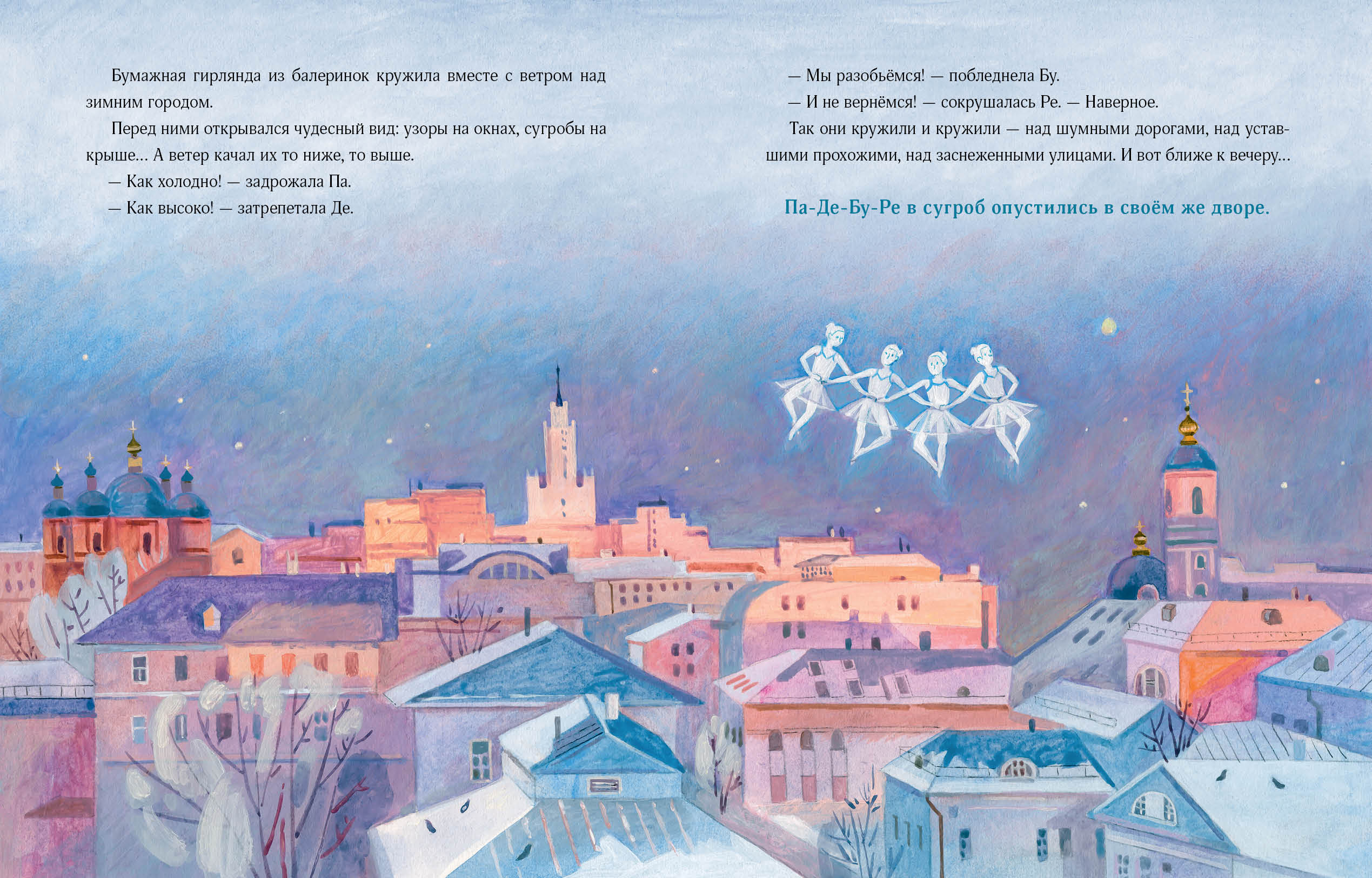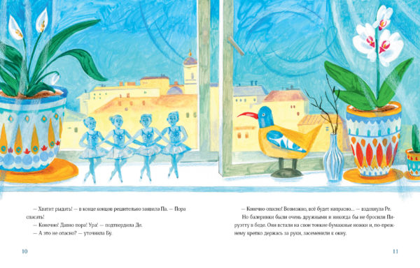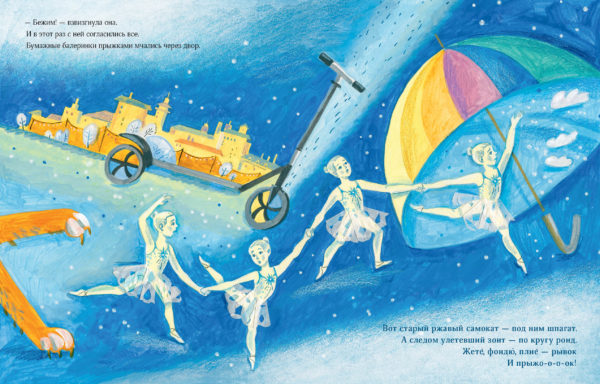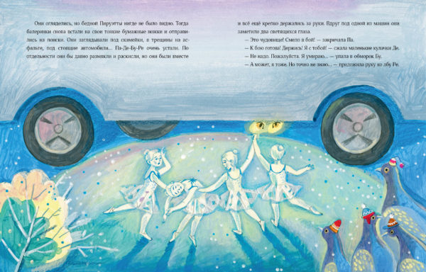 КнигиНа столе у мастерицы лежала новогодняя гирлянда из бумажных балеринок. Звали их Па, Де, Бу, Ре и Пируэтта, и они готовились все вместе станцевать на новогодней ёлке. Но внезапно порыв ветра, подхватив Пируэтту, вынес её в окно. Однако Па-Де-Бу-Ре никогда не бросят подругу в беде — они отправляются ей на помощь! Так начинаются приключения хрупких на вид, но сильных и отважных бумажных танцовщиц. Они знают главный секрет настоящей дружбы — но хватит ли этого, чтобы преодолеть все опасности, подстерегающие их в заснеженном дворе?