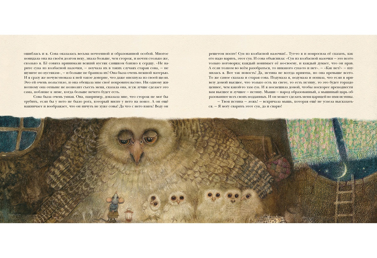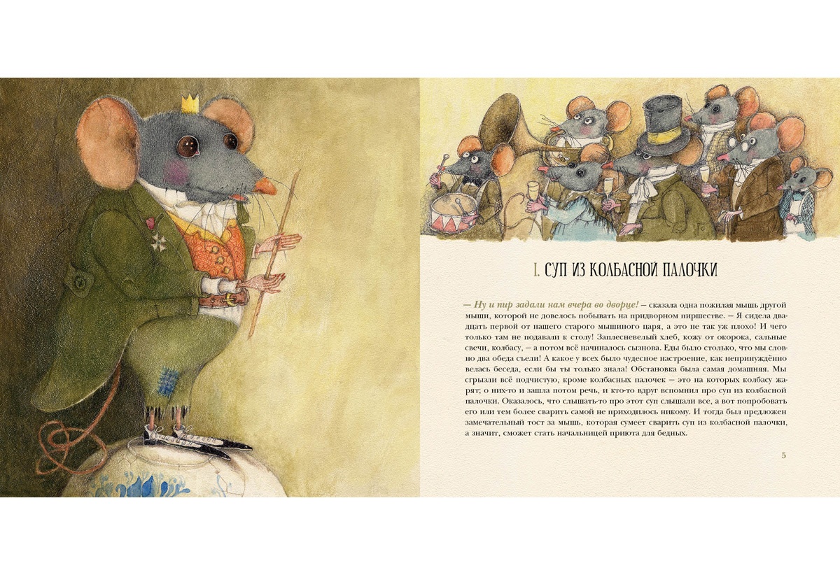 Перед вами одна из самых необычных историй великого сказочника. Однажды на большом пиру старый мышиный царь заявил во всеуслышание, что сделает царицей ту мышь, которая сварит самый вкусный суп из колбасной палочки. Но где взять заветный рецепт, способный покорить сердце хвостатого монарха? Четыре шустрые мышки отправляются в дальний путь, полный испытаний. Накануне объявленного срока все собрались на царской кухне, но- вернулись только три мышки — о четвёртой ни слуху ни духу, а ведь назначенный день вот-вот наступит.