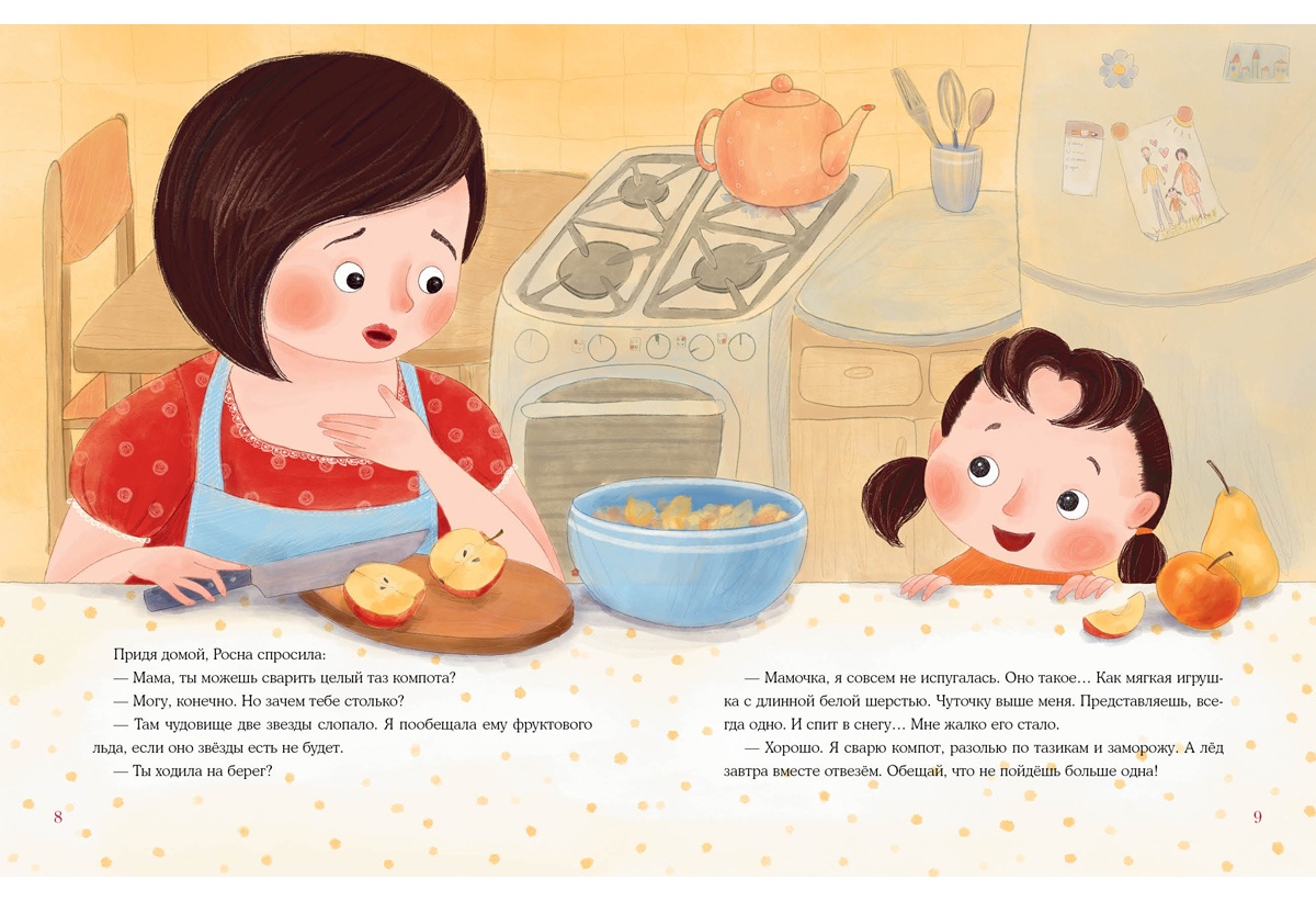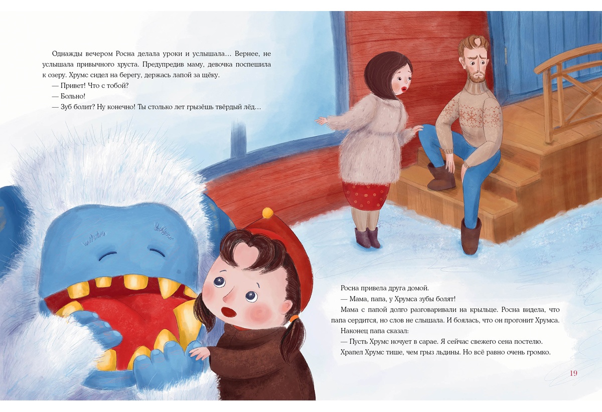 КнигиКаждую зиму жители небольшой деревушки у озера слышат по ночам громкий хруст. Они знают — это чудовище приходит на берег полакомиться льдинами. Все уже привыкли и почти не боятся. Но однажды девочка по имени Росна увидела в окно, как чудовище стянуло с неба звезду и слопало её! А за ней вторую… Росна поняла: чтобы чудовище не таскало звёзды с неба, надо предложить ему что-то повкуснее. Например, фруктовый лёд! Вскоре и все жители деревни, узнав о необычном происшествии, стали по очереди готовить лакомство для чудовища. И вот как-то вечером, после Нового года, Росна не услышала привычного хруста…