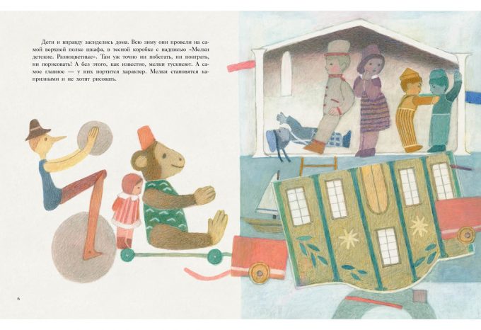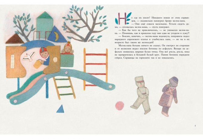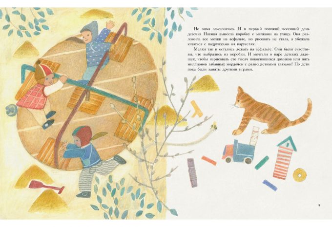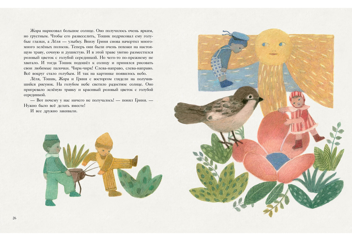 КнигиЛёля, Тошик, Жора и Гриня — озорные разноцветные мелки. Всю зиму они провели в тесной коробке в ожидании весны и вот наконец выбрались на улицу. Теперь-то можно нарисовать что-нибудь красивое! Но у Лёли выходят лишь розовые овалы, у Тошика — голубые палочки, Жора без конца вычерчивает большой жёлтый круг, а Гриня — тонкие зелёные полоски. Скучно! А что если объединить рисунки?..