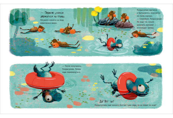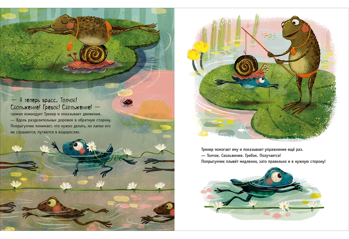 КнигиПлюх! Все головастики превратились в лягушат. Им пора брать уроки плавания. У малыша Попрыгунчика получается далеко не всё, но он очень храбрый и очень старается. А значит, скоро Попрыгунчик научится нырять, прыгать и даже плавать в костюме!