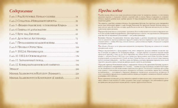 Выходящая в российский Год истории и год 200-летия победы России в Отечественной войне 1812 года книга о М. И. Кутузове является уникальным по содержанию и оформлению изданием. Полно и научно достоверно описываются облик, родословная, а также военная, государственная и дипломатическая деятельность великого сына России. Собранный воедино богатый иллюстративный материал из музеев и архивов России, ряда стран СНГ и Европы — около 300 жанровых картин, портретов, карт, писем, рескриптов, приказов и прочего — наглядно показывает жизненный путь одного из величайших полководцев.